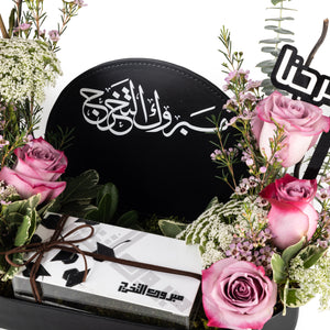 احتفل بلحظة خاصة للخريج مع ستاند فاخر بيضاوي الشكل مزين بجملة "مبروك التخرج"، مُنسق بشكل جميل بمزيج من زهور الواكس، والبيتوسبوروم، جميعها مرتبة بعناية وأناقة ومزينة بستك "إحنا تخرجنا".