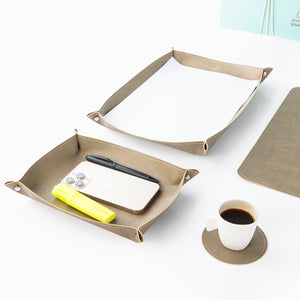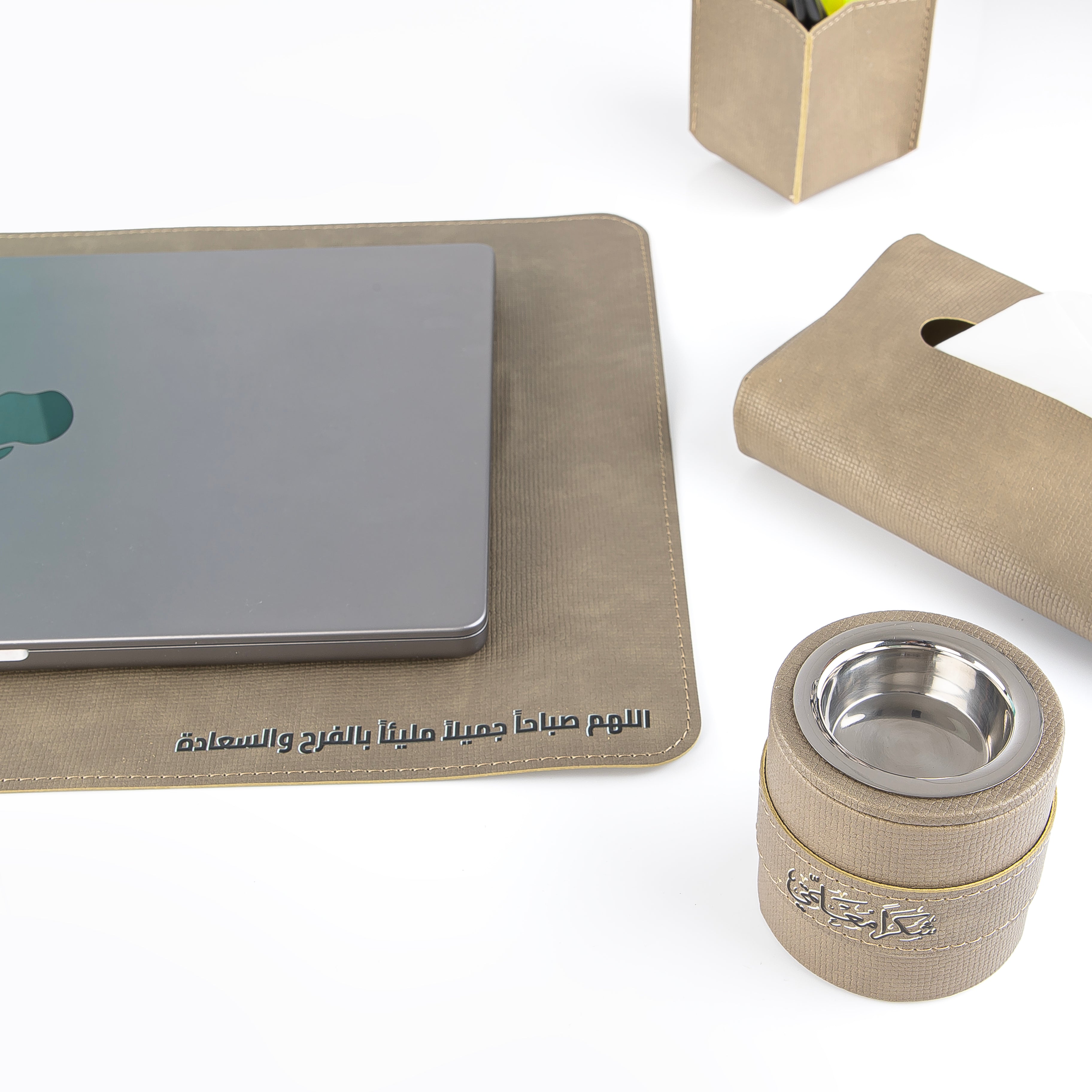 أضف لمسة من الفخامة والتنظيم إلى مكتبك مع هذا الطقم المكتبي الجلدي الأنيق باللون الزيتي.