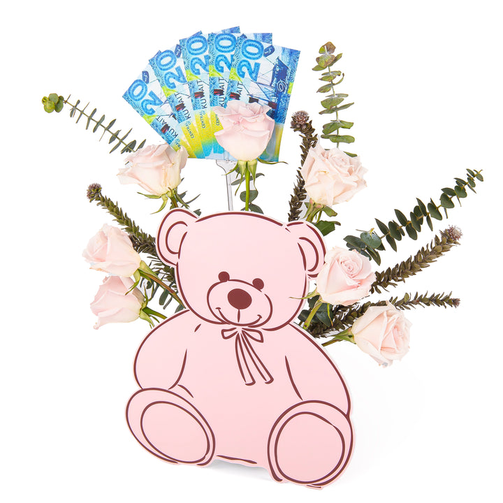 تيدي بينك هدية للمولود الجديد تتكون من استاند اكريليك أنيق على شكل دب بينك مرح، واتاحة وضع مفاجأة نقدية تضيف لمسة من السعادة. هدية مثالية تجمع بين الأناقة والفرح