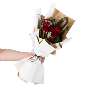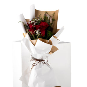 استمتع بجمال باقة الورود الحمراء الكلاسيكية الخالدة، مزيج مثالي من الأناقة والرقي. تتميز هذه التشكيلة الرائعة بورود حمراء نابضة بالحياة، ملفوفة بعناية في غلاف أنيق باللونين الأبيض والذهبي، مما يخلق تباينًا رائعًا يضيف لمسة من الفخامة إلى أي مناسبة.