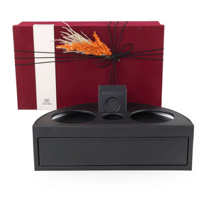 Black leather set of circular stand contains two thermoses with fabric covers, six tea glasses, six coffee glasses, six coasters
