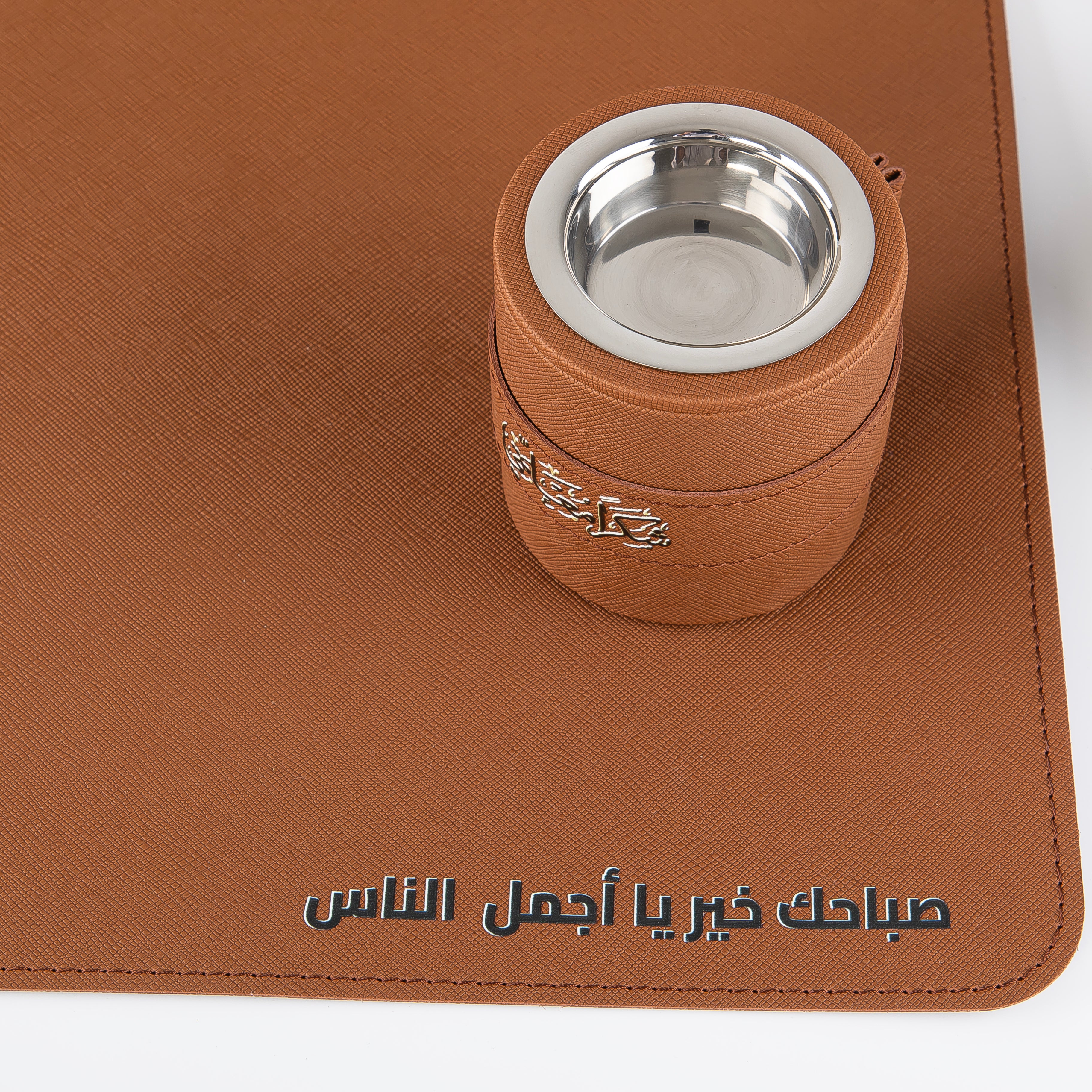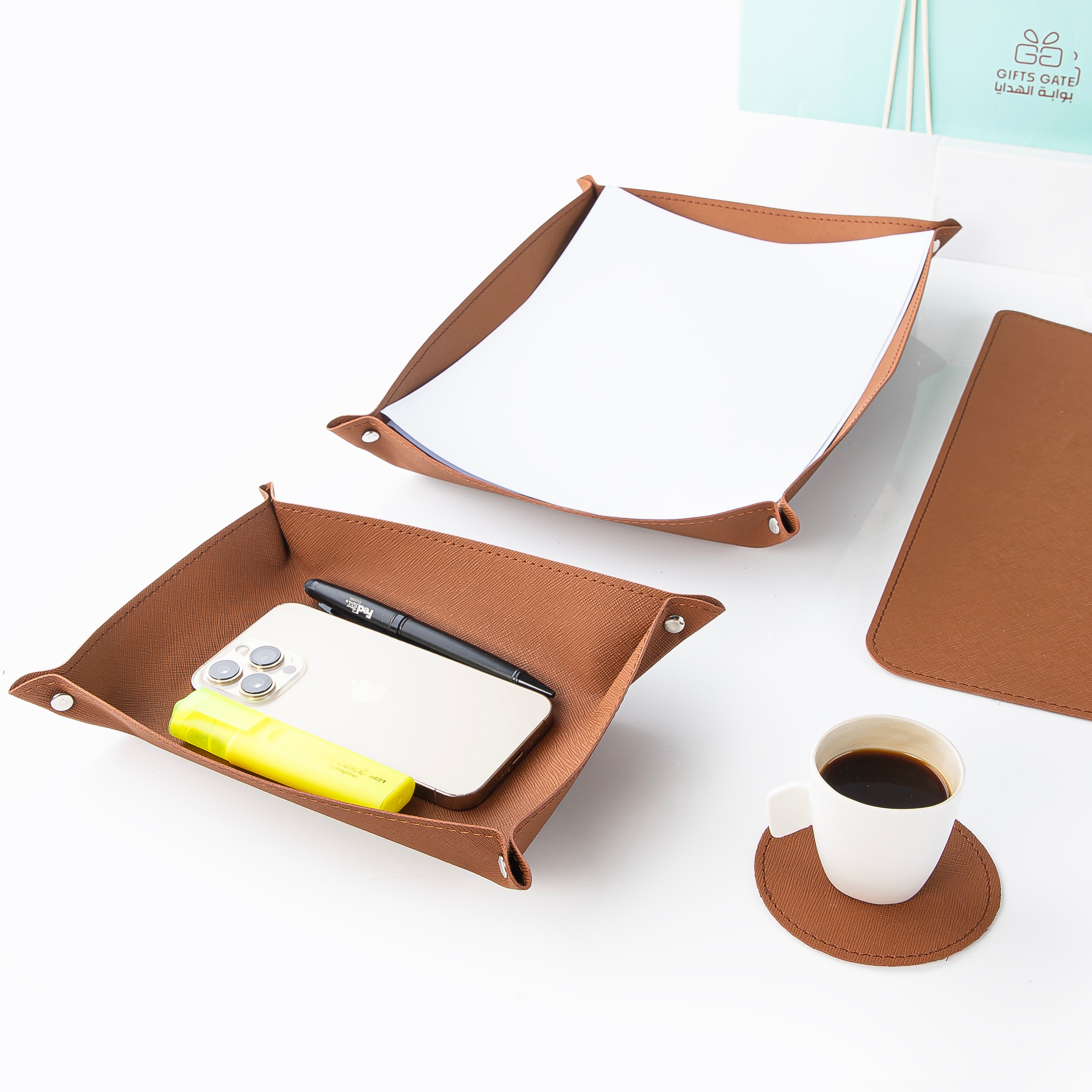 أضف لمسة من الفخامة والتنظيم إلى مكتبك مع هذا الطقم المكتبي الجلدي الأنيق باللون البني.