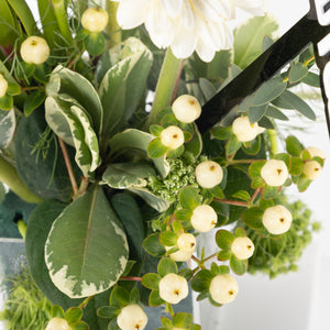 يتضمن التنسيق الزهري توت الهايبيريكوم النابض بالحياة، مزيج جربيرا ملون، مزيج سفاري الاستوائي، أوراق البيتوسبوروم الخضراء، أزهار أمي ماجوس، وطحالب خضراء كثيفة، كلها مرتبة بعناية على إسفنجة زهور للحفاظ على الجمال والنضارة لفترة طويلة.