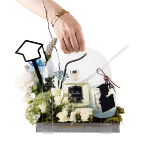 احتفل بتخرجهم بأناقة مع باقة التخرج الأنيقة هذه. تحتوي على زهور داخل علبة أكريليك أنيقة، وشمعة عطرية مريحة، ودفيوزر منعش، لتكون الهدية المثالية للاحتفال ببداية جديدة.