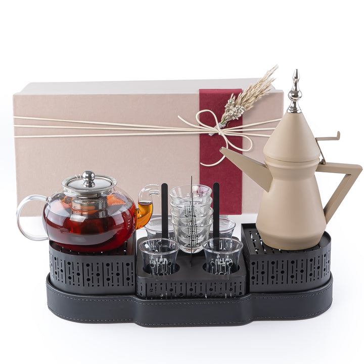 • ستاند للدلة معدن باللون الفضي و صينية مغلفة بالجلد