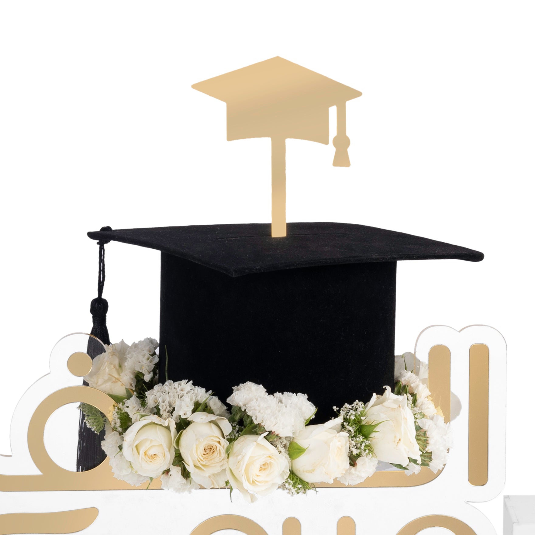 اجعل يوم تخرجك لحظة لا تُنسى مع هذا الطقم الفاخر الذي يجسد الفخر والاحتفال بإنجازك العظيم. يتكون منقبعة تخرج أنيقة محاطة بورود الجوري البيضاء التي تضيف لمسة من الرقي والجمال مع عبارة تهنئة "ألف مبروك" مدمجة في التصميم لتقديم تهنئة رائعة تليق بالمناسبة. بالاضافة الى ستاند على شكل قبعة تخرج، مثالي لإضافة المال كهدية بطريقة مميزة وأنيقة.