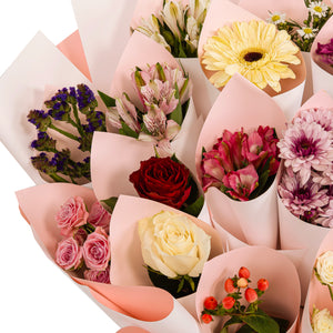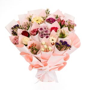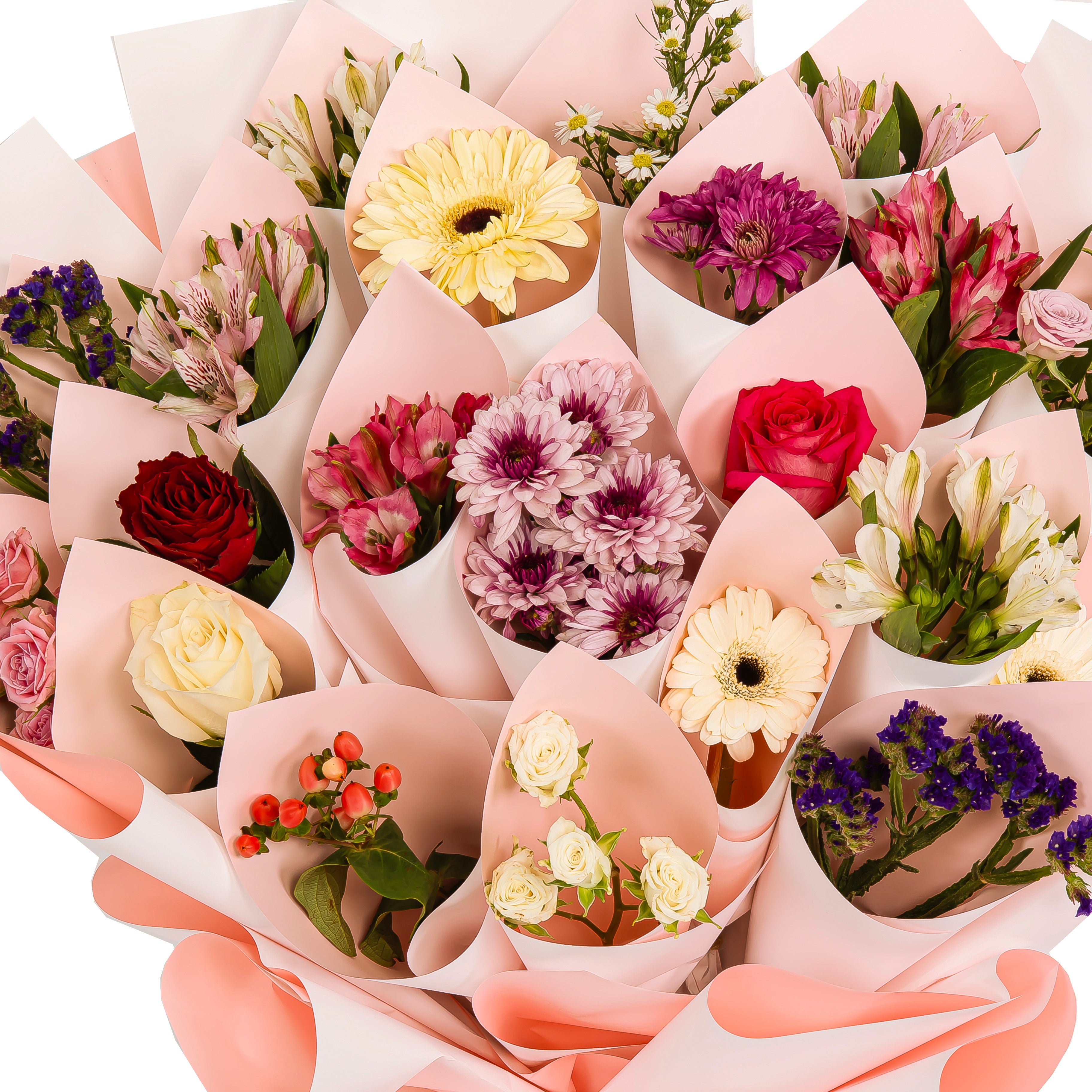 باقة مميزة تضم تشكيلة متنوعة من الزهور مثل الورد الصغير، الجربيرا، الأقحوان، الستاتيس، الكريزانتيم، وزهور البوفلوروم مع لمسات من الزهور الصغيرة الإضافية. مغلّفة بورق وردي وأبيض أنيق يمنحها مظهرًا عصريًا ومبهجًا. مثالية للهدايا الفاخرة، المناسبات الخاصة، أو لإضفاء لمسة من البهجة على أي مكان. منسّقة يدويًا بعناية لتصل طازجة وجاهزة لإبهار من تحب.