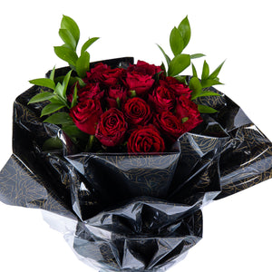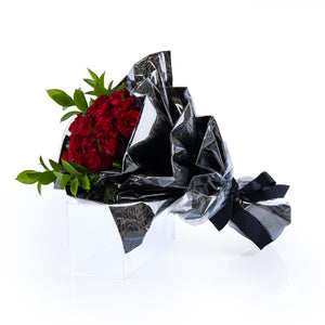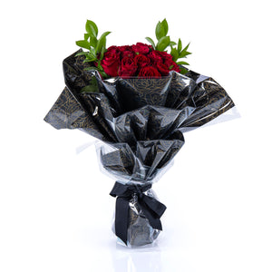 باقة فاخرة من الورد الأحمر الداكن (غالبًا من نوع الروز)، مغلّفة بورق أسود أنيق مع لمسة من الأوراق الخضراء الطبيعية. مثالية للتعبير عن المشاعر العميقة، أو للاحتفال بالمناسبات الخاصة مثل الذكرى السنوية أو عيد الحب. منسّقة يدويًا بعناية، وتُسلّم طازجة وجاهزة لإبهار من تحب.