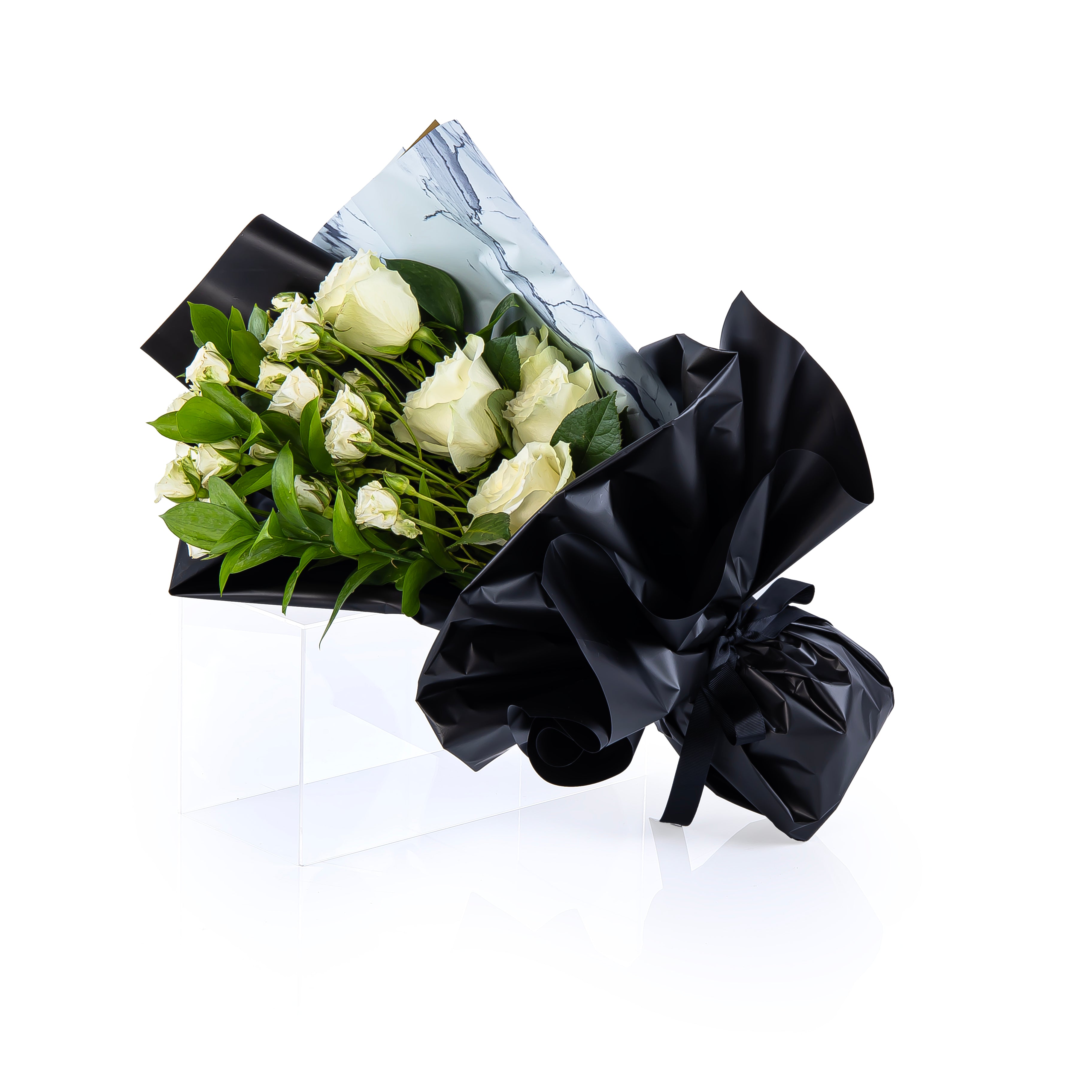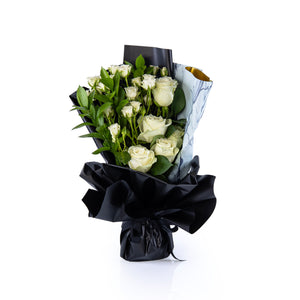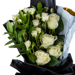 باقة أنيقة من الورد الأبيض مع براعم صغيرة وأوراق خضراء طبيعية، مغلّفة بورق أسود مع لمسة رخامية فاخرة. مثالية للهدايا الراقية، حفلات الزفاف، أو للتعبير عن النقاء والبدايات الجديدة. منسّقة يدويًا بعناية لتصل طازجة وجاهزة لإبهار من تحب.