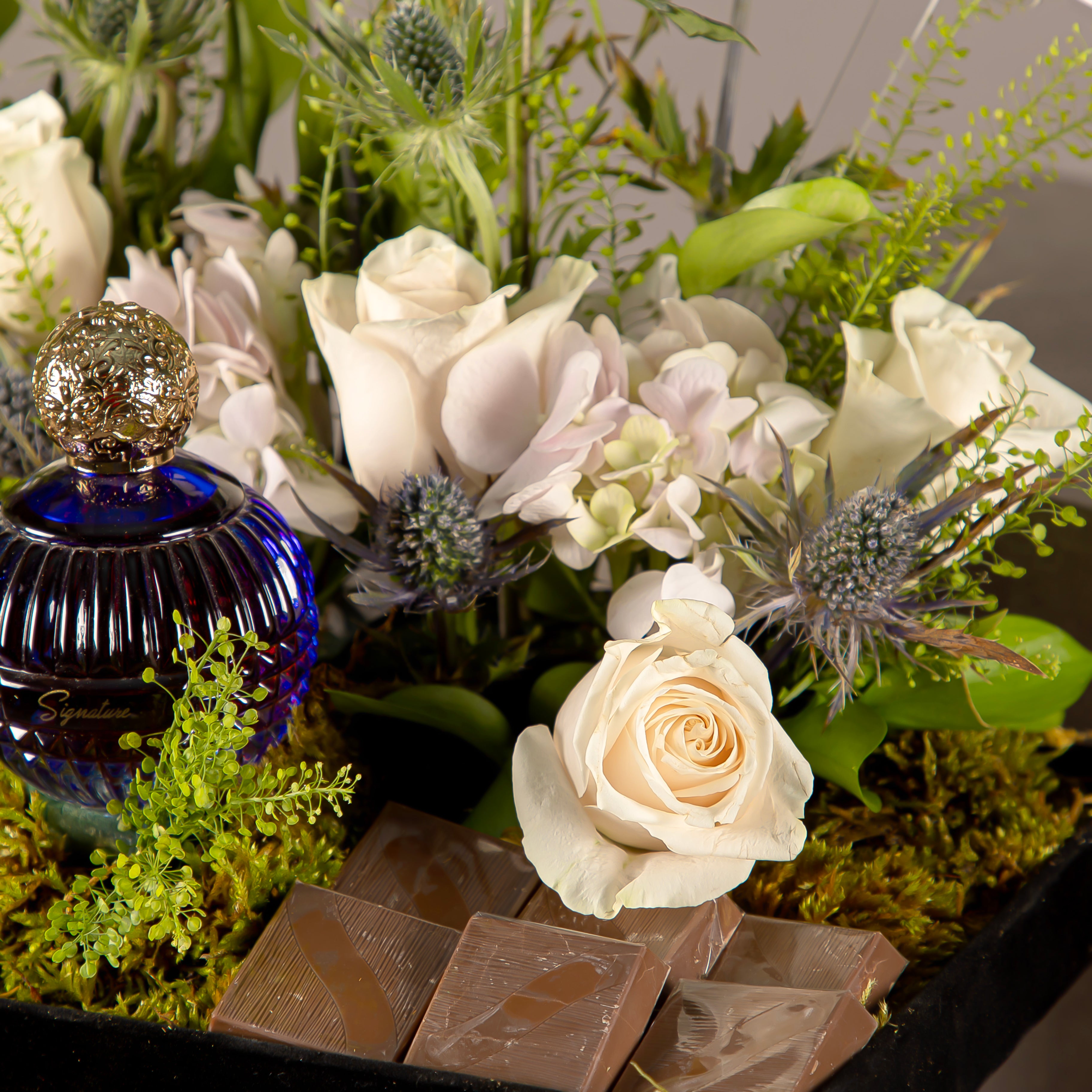 تأتي الباقة مع بيرفيوم Signature المميز لمنح أجواء الانتعاش والتعطير وشوكولا فاخرة بطعم غني يضيف لمسة من السعادة.
