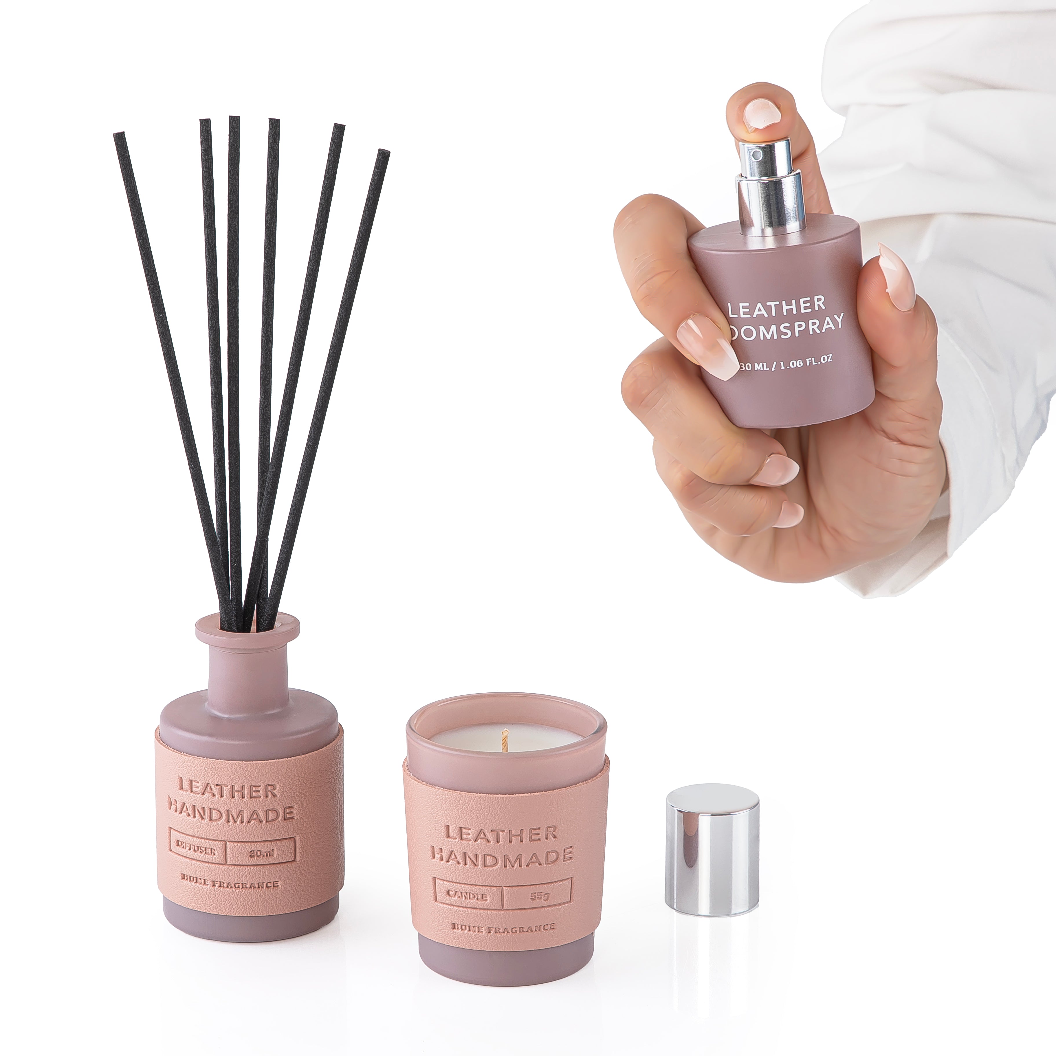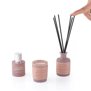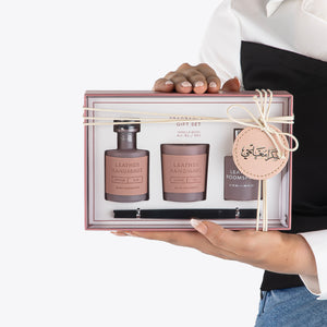 طقم أنيق مقطوع بالليزر، يضم ناشرًا وشمعة مغلفين بالجلد يدويًا، يضفي لمسة راقية وفاخرة. مع عطر منزلي فاخر، يُضفي هذا الطقم جوًا دافئًا وراقيًا. يأتي في علبة أنيقة، مثالية للهدايا في المناسبات الخاصة كعيد المعلم.