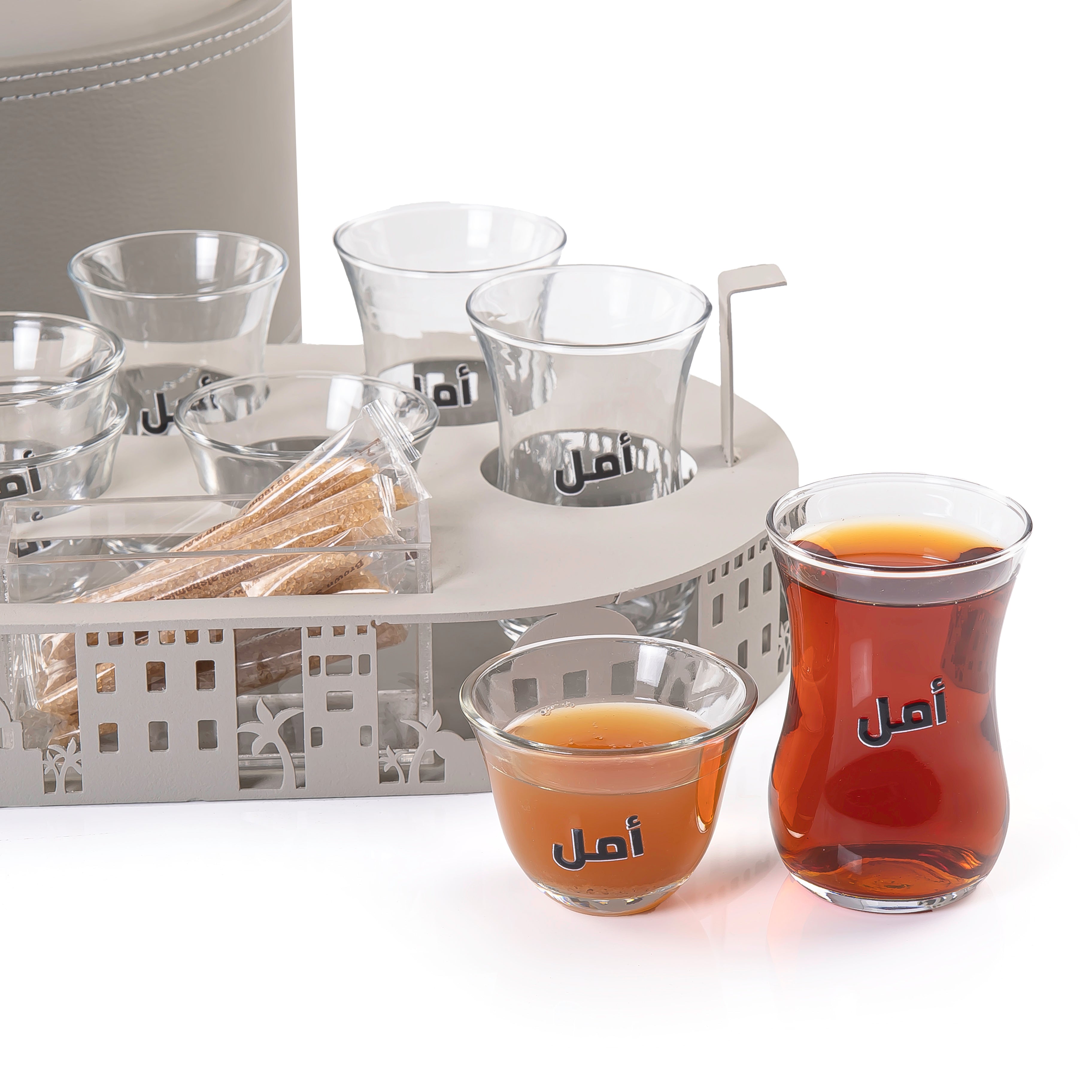 تتميز بأنها مصنوعه من المعدن مع قاعدة جلد ما يجعله إضافة رائعة لأي مناسبة ، حيث تأتي مع 6 استكانات شاي و 6 فناجين قهوة و بوكسين اكريلك سهلة التنظيف ، تأتي مع بوكس الهدايا من بوابة الهدايا مما يجعله خيارًا مثاليًا كهدية أنيقة لأي مناسبة.