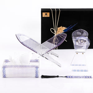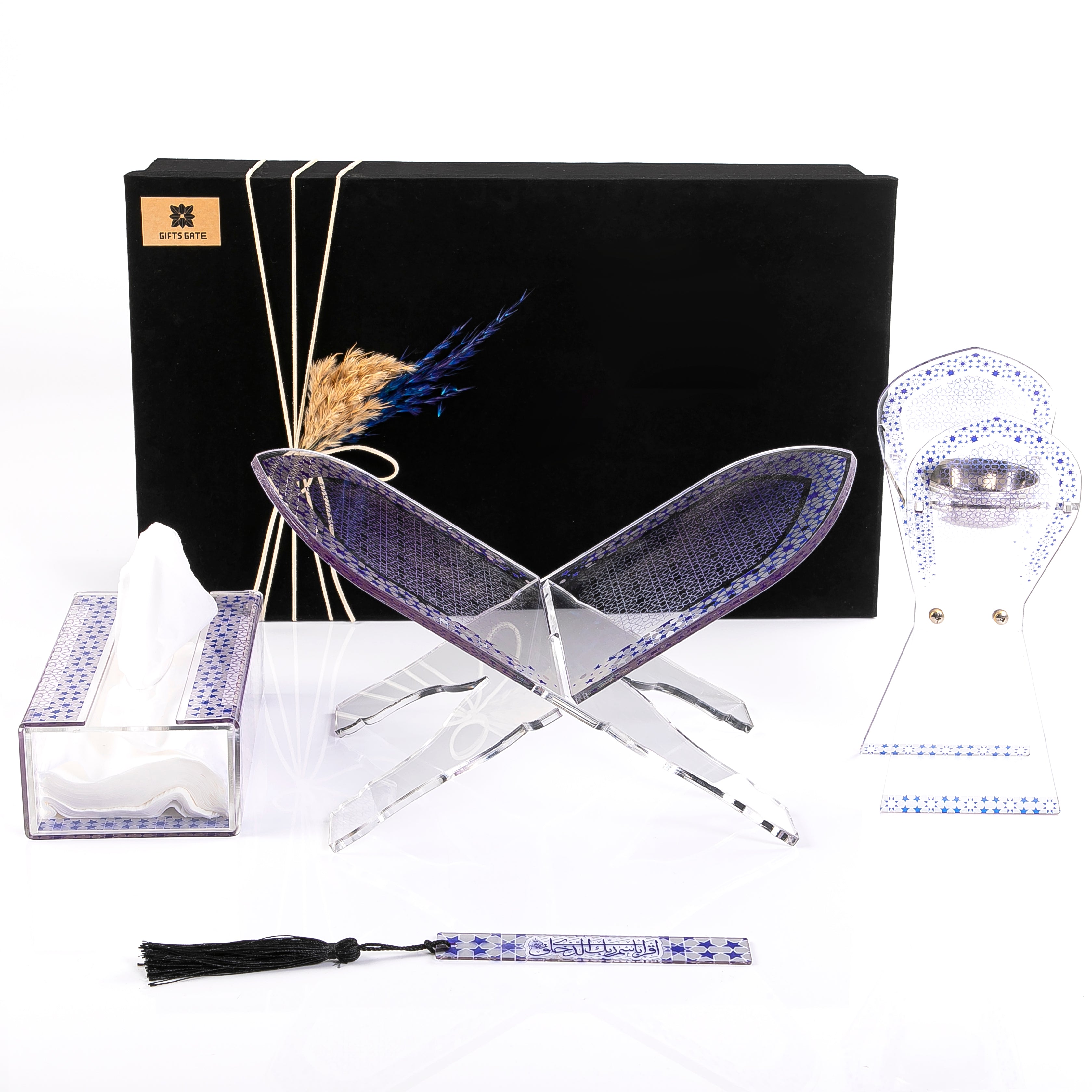 الطقم مكون من حامل وفاصل للقرأن الكريم , مبخر وعلبه كلينكس , الطقم صناعه كويتية ومصنوع من اكريلك عالى الجودة .