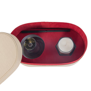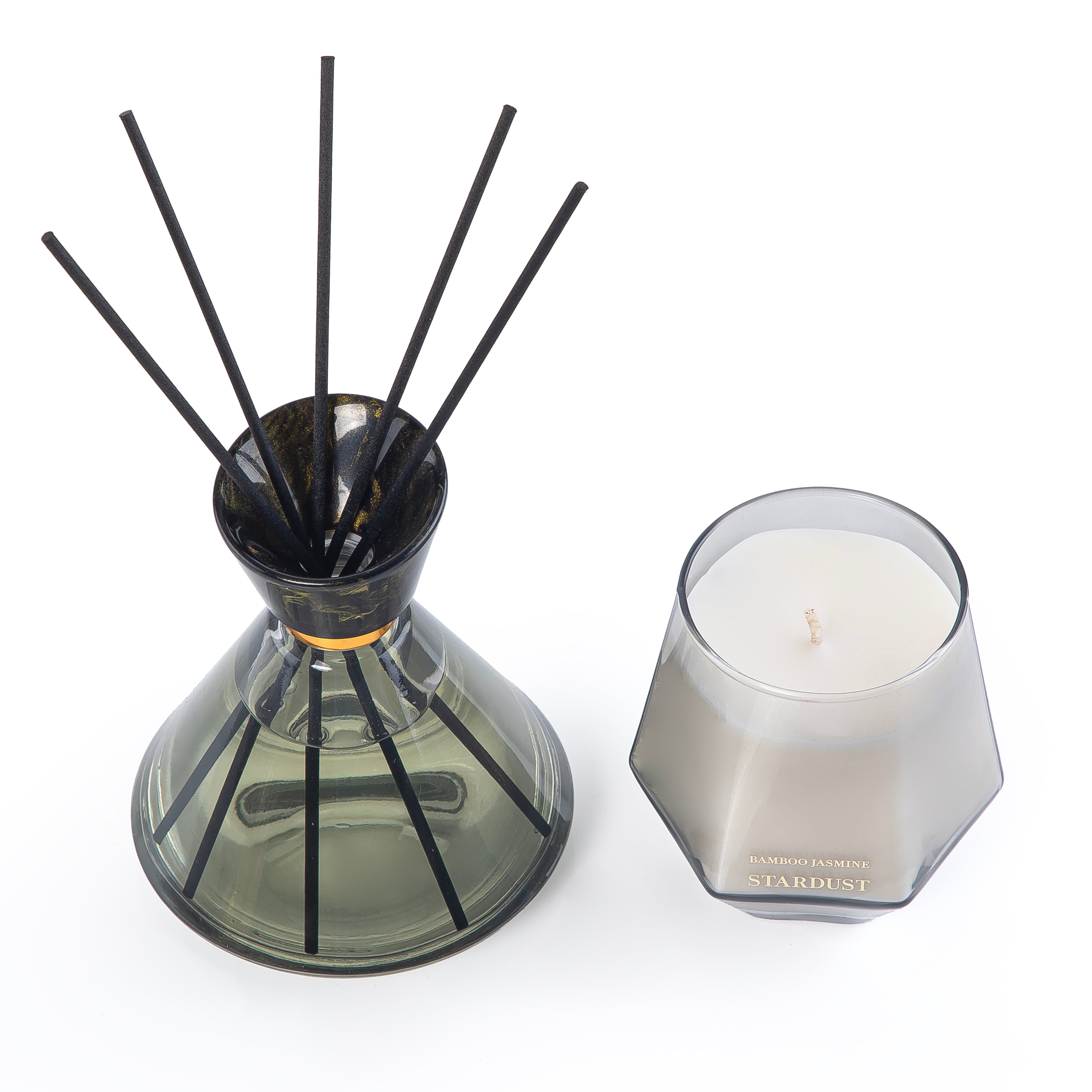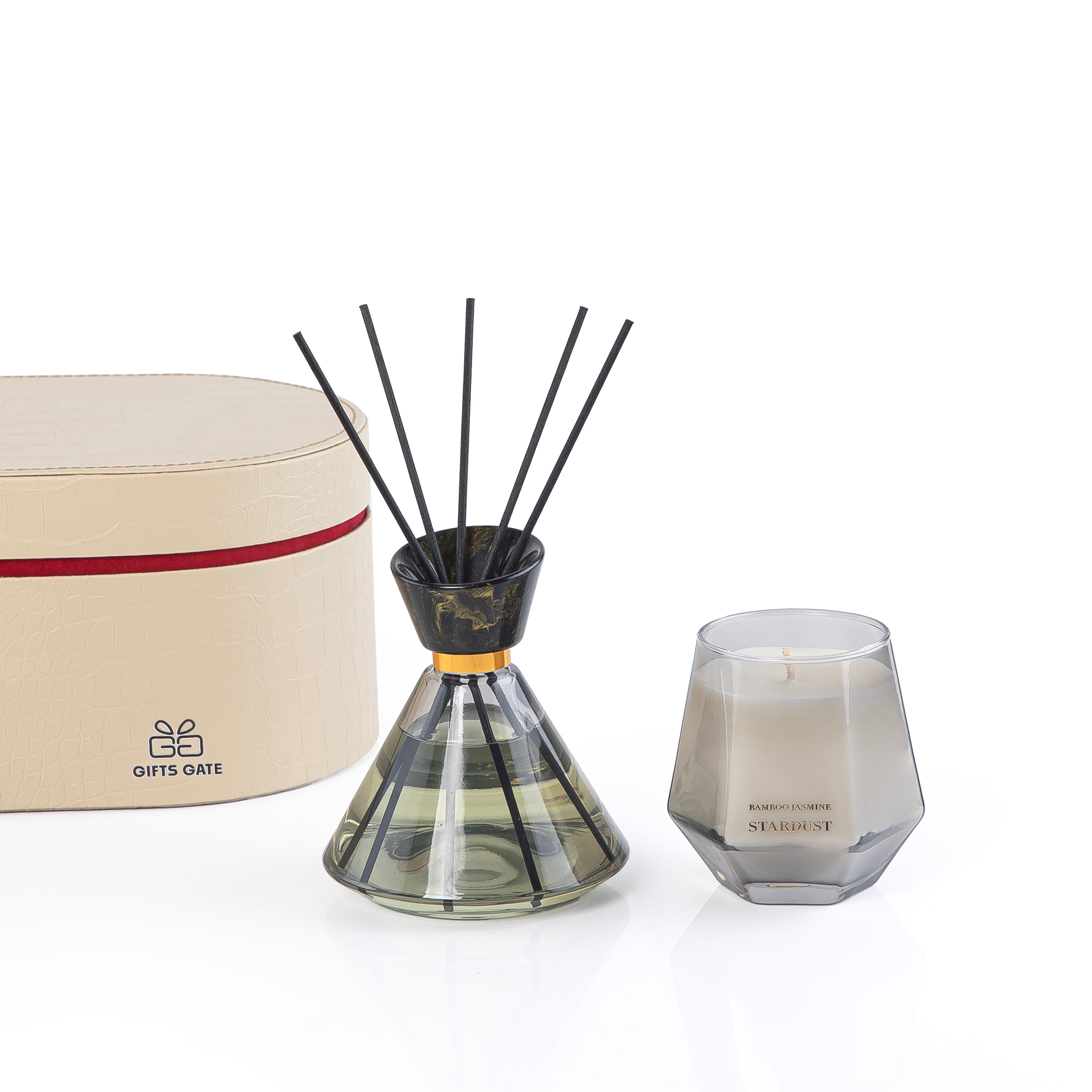 العطرية الرائعة المكونة من قطعتين. تتضمن المجموعة شمعة معطرة فاخرة مع موزع عطر أنيق، لتحويل أي غرفة إلى ملاذ هادئ. تأتي المجموعة في علبة هدايا فاخرة مصممة بشكل جميل، وهي الخيار الأمثل لمن يرغب في تحسين أجواء منزله أو إهداء هدية مميزة لشخص يقدر المتع الحسية الراقية والأناقة الراقية.