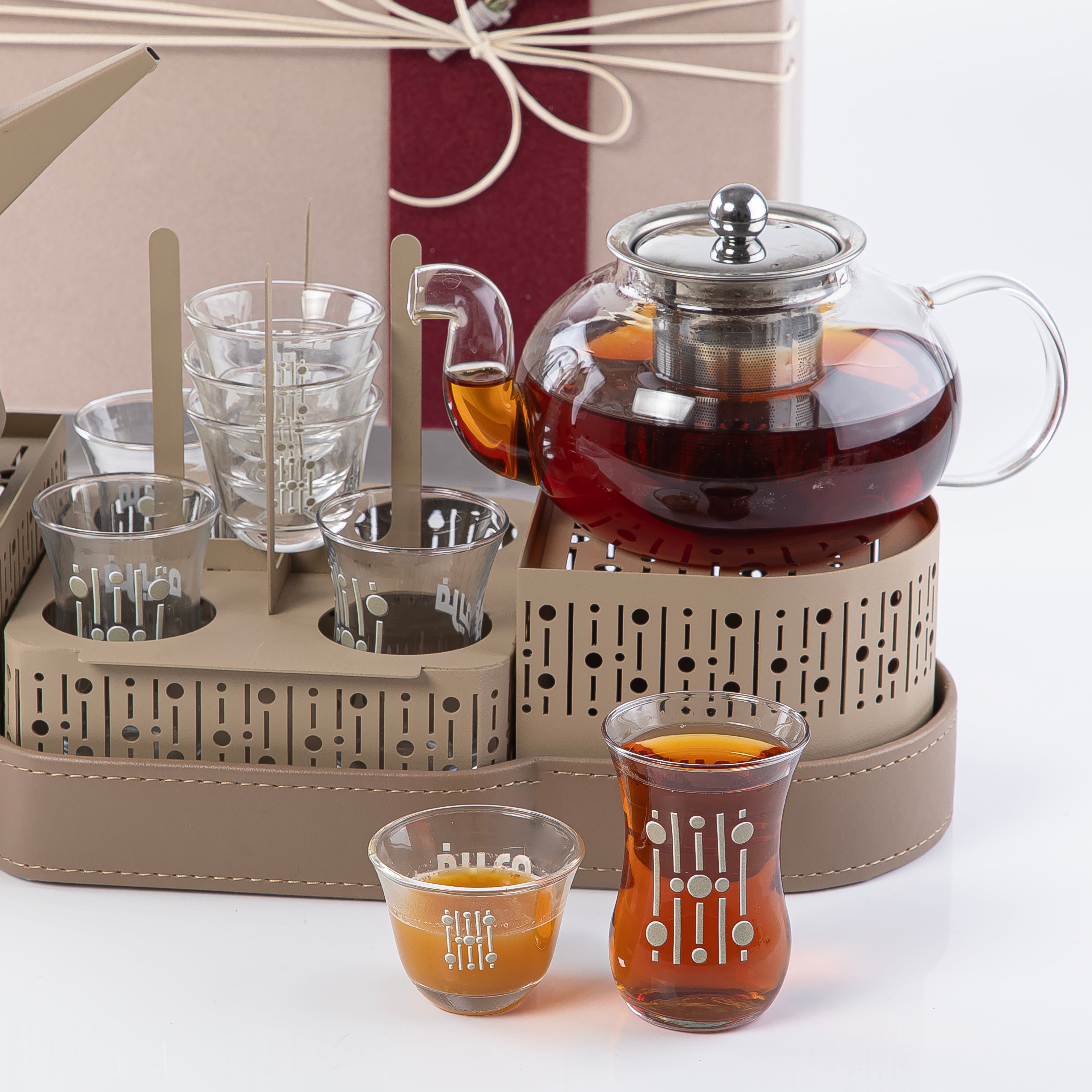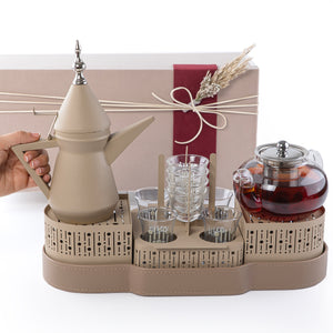 - ستاند للدلة معدن باللون الداست و صينية مغلفة بالجلد