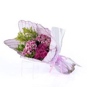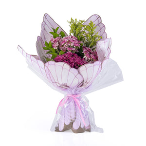 استمتع بمزيج ساحر يجمع بين جمال الطبيعة وإبداع التصميم. تتميز هذه الباقة بتنسيق فريد من زهور القرنفل ذات الألوان الوردية والبنفسجية الجذابة، التي تعبر عن التقدير والمودة.