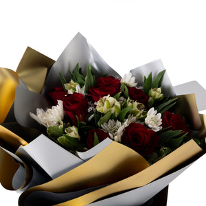 استمتع بجمال باقة الأزهار الكلاسيكية المختلطة الخالدة، مزيج مثالي من الأناقة والرقي. تتميز هذه التشكيلة الرائعة بورود حمراء نابضة بالحياة وورود بيضاء صافية، ملفوفة بعناية في غلاف أنيق، مما يخلق تباينًا رائعًا يضيف لمسة من الفخامة إلى أي مناسبة.