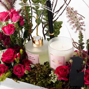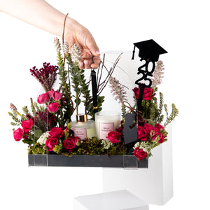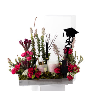 احتفل بتخرجهم بأناقة مع باقة التخرج الأنيقة هذه. تحتوي على زهور داخل علبة أكريليك أنيقة، وشمعة عطرية مريحة، ودفيوزر منعش، لتكون الهدية المثالية للاحتفال ببداية جديدة.