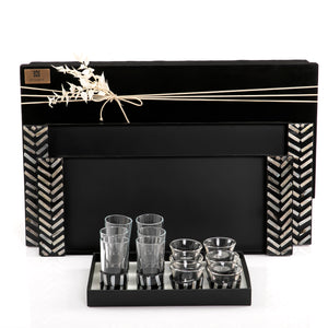 قدمي الشاي الساخن لضيوفك بالحصول على طقم الإستكانات الجذابه . يتكون من 6 استكانات مع 6 فناجين  بتصميم عصري أنيق مصنوعه من الصدف. بالاضافه الى 2 صواني تقديم معدن بمقابض صدف ومصنوعه من خامات عالية الجودة لضمان الاستدامة ما يجعله إضافة مثالية لخزانة الأواني خاصتك, كما يمكن تنظيفه بكل سهولة .(مع بوكس هدايا فاخر)