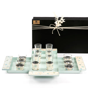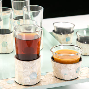 قدمي الشاي الساخن لضيوفك بالحصول على طقم الإستكانات الجذابه . يتكون من 6 استكانات مع 6 فناجين بتصميم عصري أنيق مصنوعه من الصدف. بالاضافه الى 2 صواني تقديم معدن بمقابض صدف ومصنوعه من خامات عالية الجودة لضمان الاستدامة ما يجعله إضافة مثالية لخزانة الأواني خاصتك, كما يمكن تنظيفه بكل سهولة .(مع بوكس هدايا فاخر)