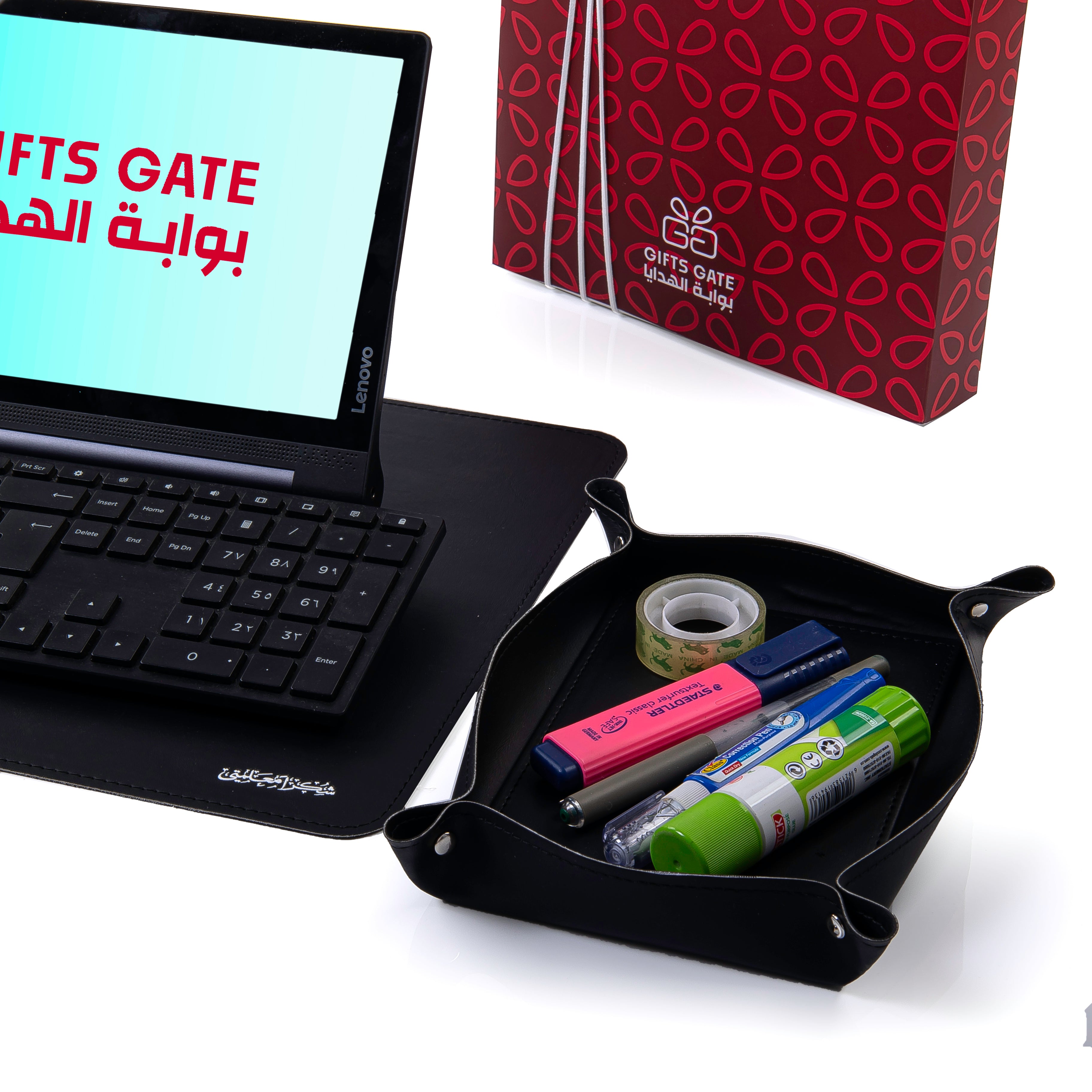 Black leather office set contain office mat, pen holder, coaster, and mini mirror