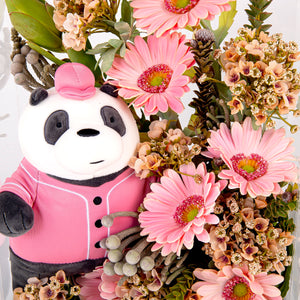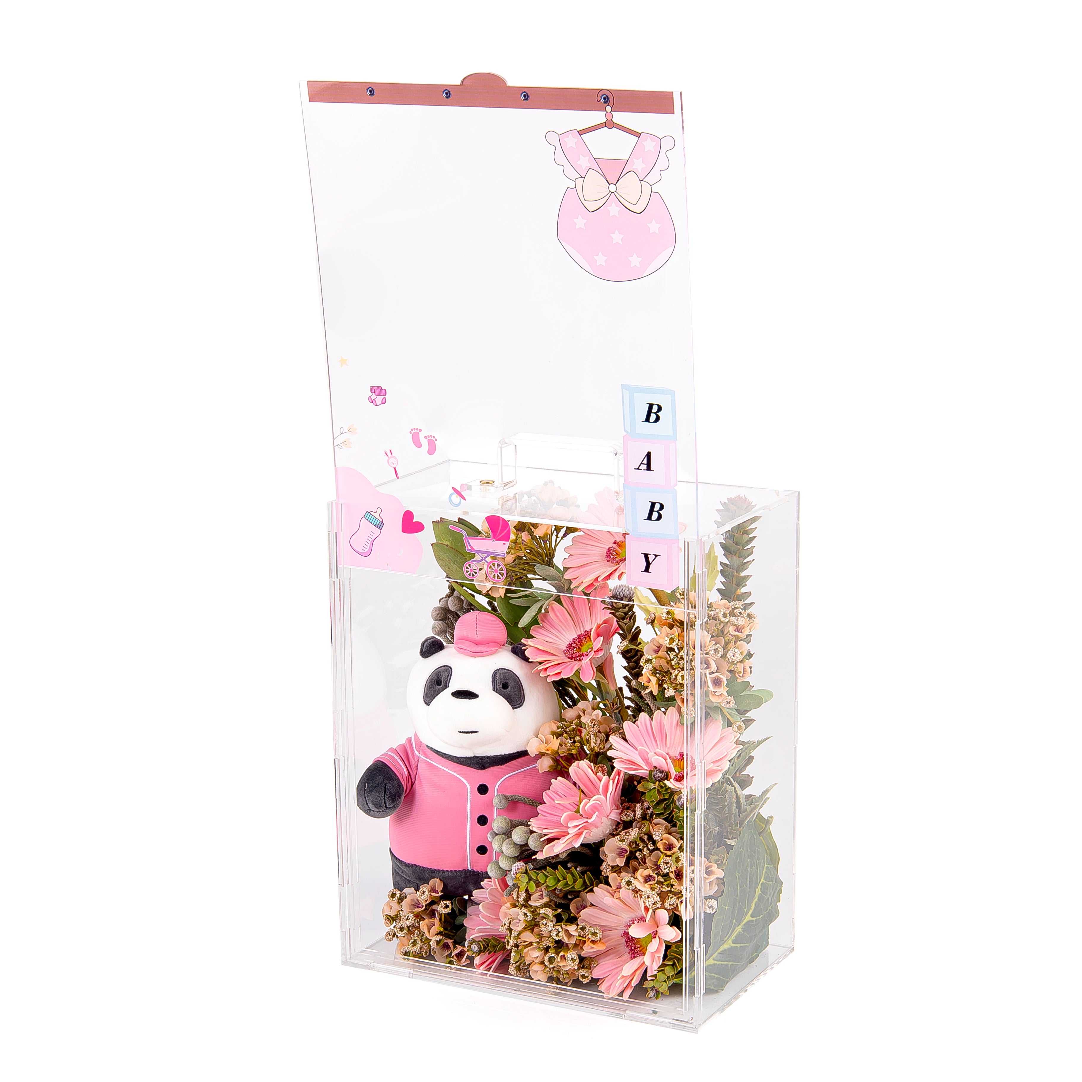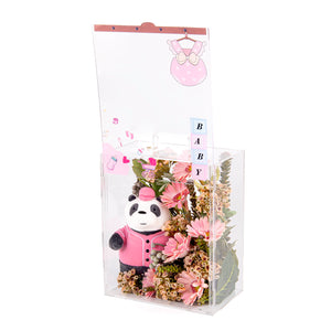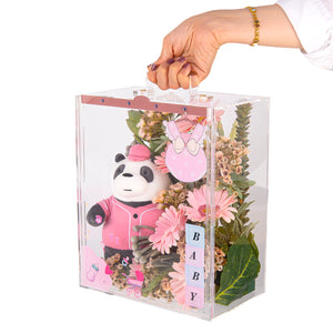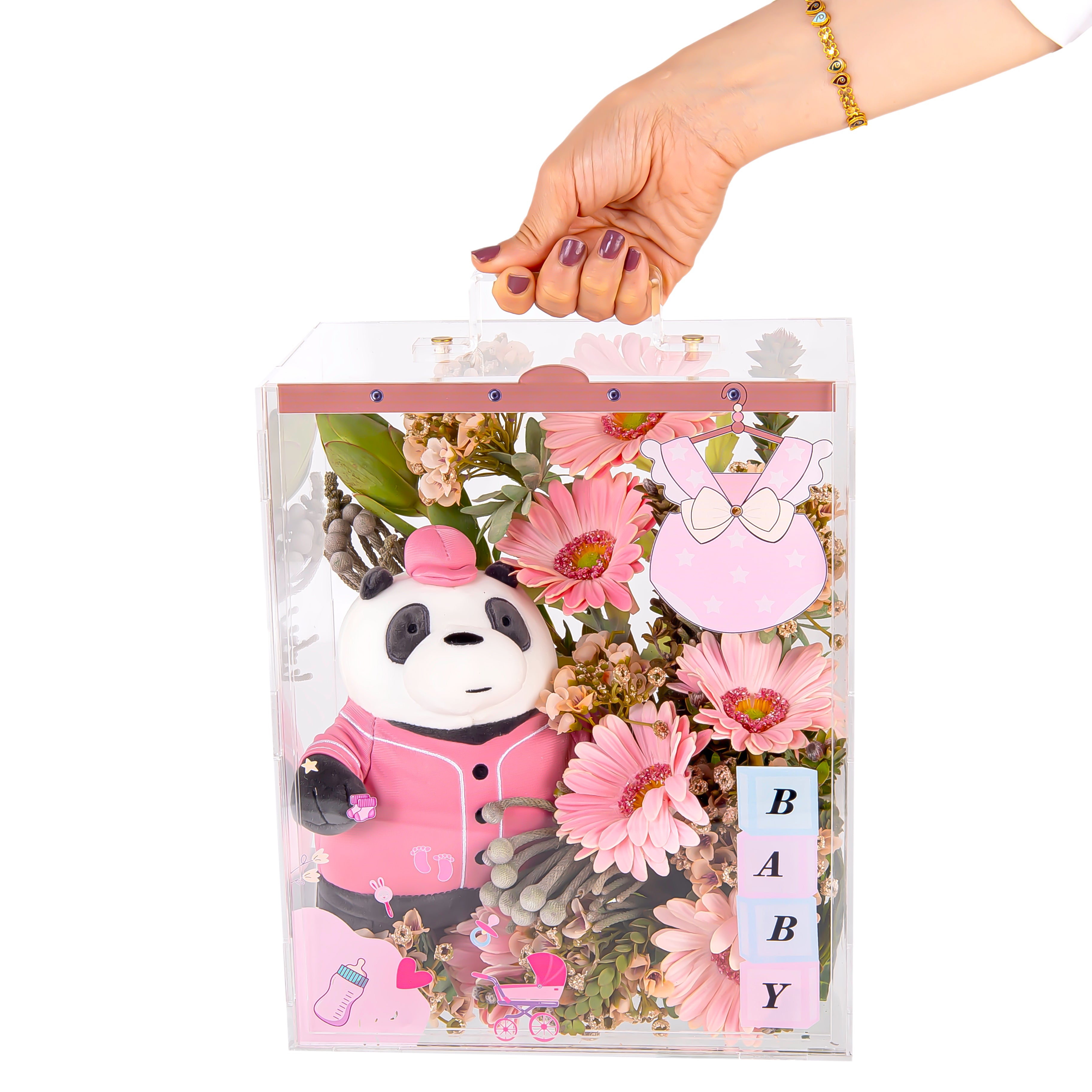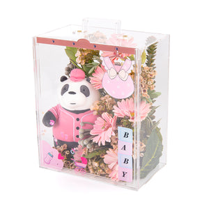 The New Baby 3 Gift Box for a newborn baby consists of an elegant acrylic box featuring a fun pink panda, along with a natural flower arrangement for a touch of joy. You can also add a cash surprise for added happiness. The perfect gift that combines elegance and joy.