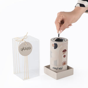 Add a touch of elegance to your home with this beautifully designed mabkhar set. Featuring a colorful UV-printed floral pattern and wrapped in premium light beige plain leather, this piece combines traditional function with modern sophistication. The mabkhar is presented in a sturdy cardboard tray and elegantly covered with a clear acrylic case, making it perfect for both daily use and gifting.