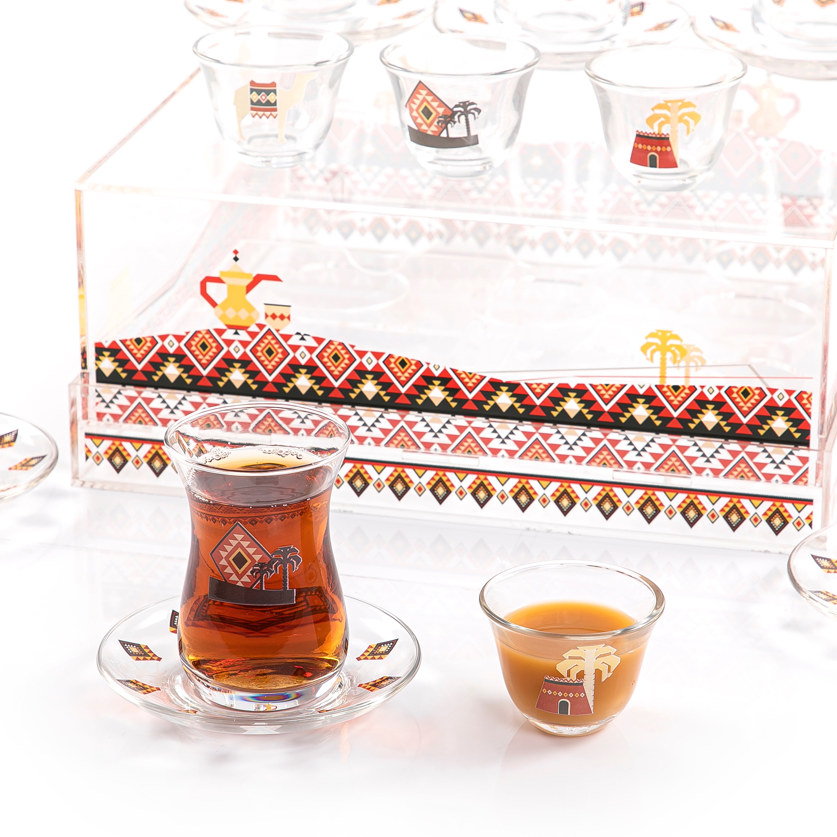Enjoy your gatherings with the elegant and modern Sadu design serving set, which combines the past and the present. Made from high-quality acrylic, it features beautiful patterns inspired by traditional tents. It is perfect for serving tea and Arabic coffee and is sure to leave a lasting impression on your guests.