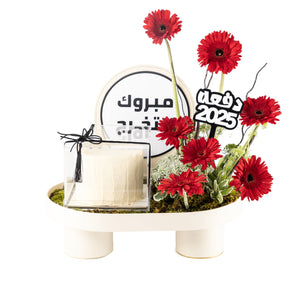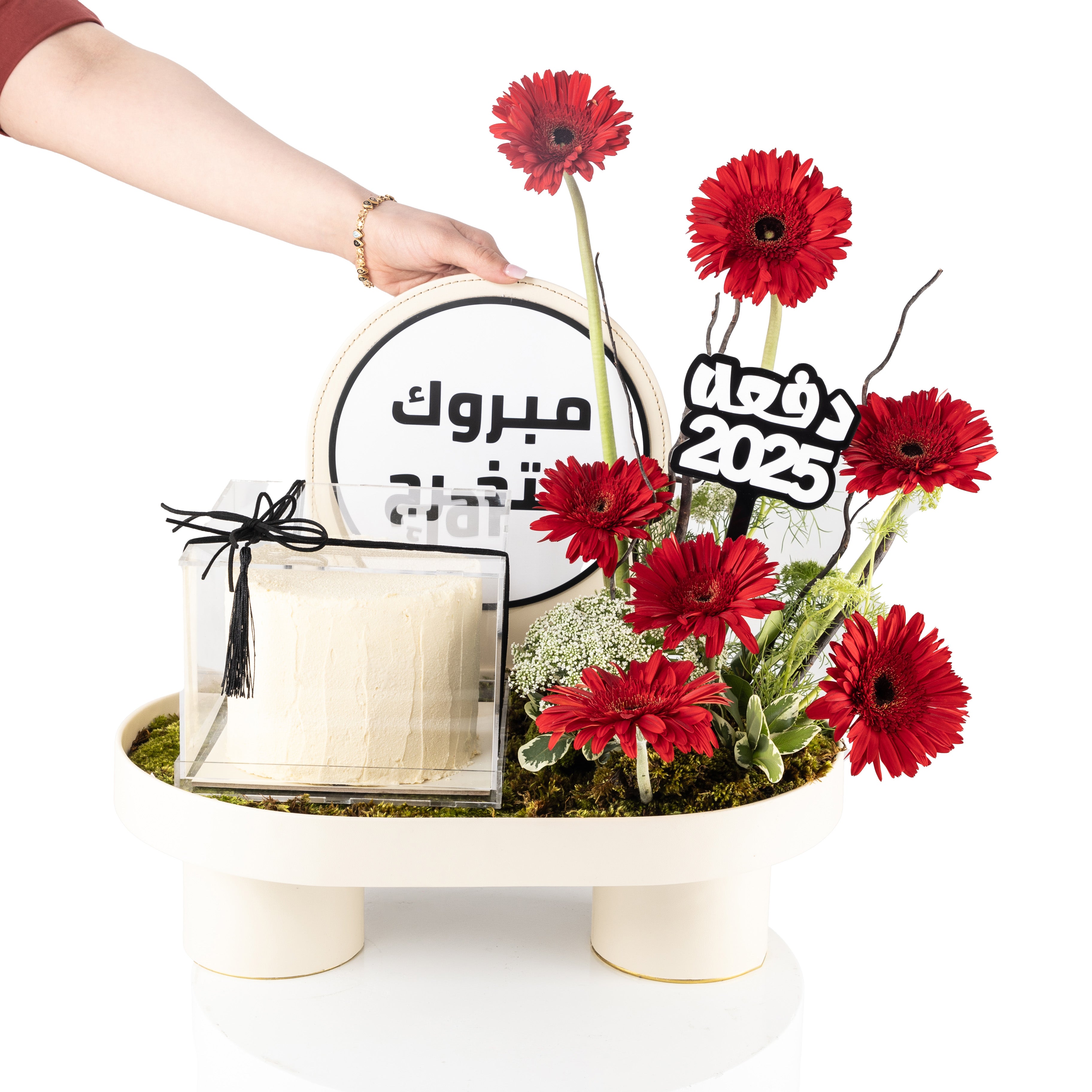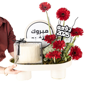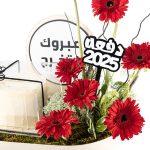 Celebrate graduation in style with this elegant oval stand featuring a decorative pillar and a vibrant mix of Gerbera, Ammi Majus, and Mathiola flowers, artistically arranged on fresh green moss and flower sponge. The tray includes a black acrylic graduation stick with white text, a delightful cake mix, and a clear acrylic box for the cake — the perfect blend of sweet and floral to mark a proud achievement.