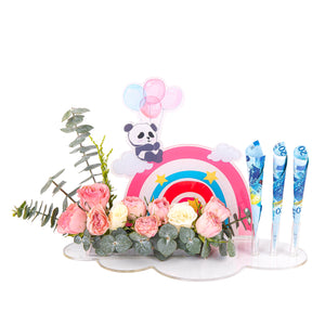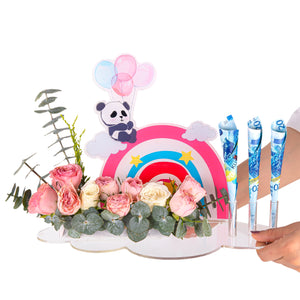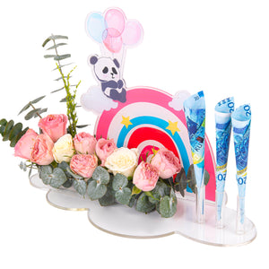 A money gift stand for a newborn baby consisting of an elegant acrylic box with a colorful stand and a natural flower arrangement for a touch of joy. You can also include a cash surprise for an added touch of happiness. A perfect gift that combines elegance and joy.