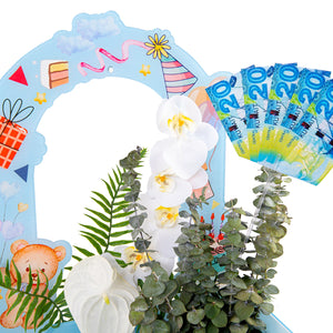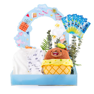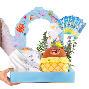 Teddy Bear is a newborn gift. It consists of an elegant acrylic box containing a patterned baby bib and a playful lemon bear, along with a natural flower arrangement for a touch of joy. You can also add a cash surprise for added happiness. The perfect gift that combines elegance and joy.