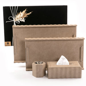 Fill the air around you with the refreshing scent of incense with this elegant incense set, featuring a practical and distinctive design. This set includes two leather trays, a tissue box, and a beige leather-covered incense burner, perfect for enhancing your home’s atmosphere or as a luxurious gift for special occasions.