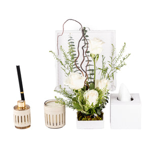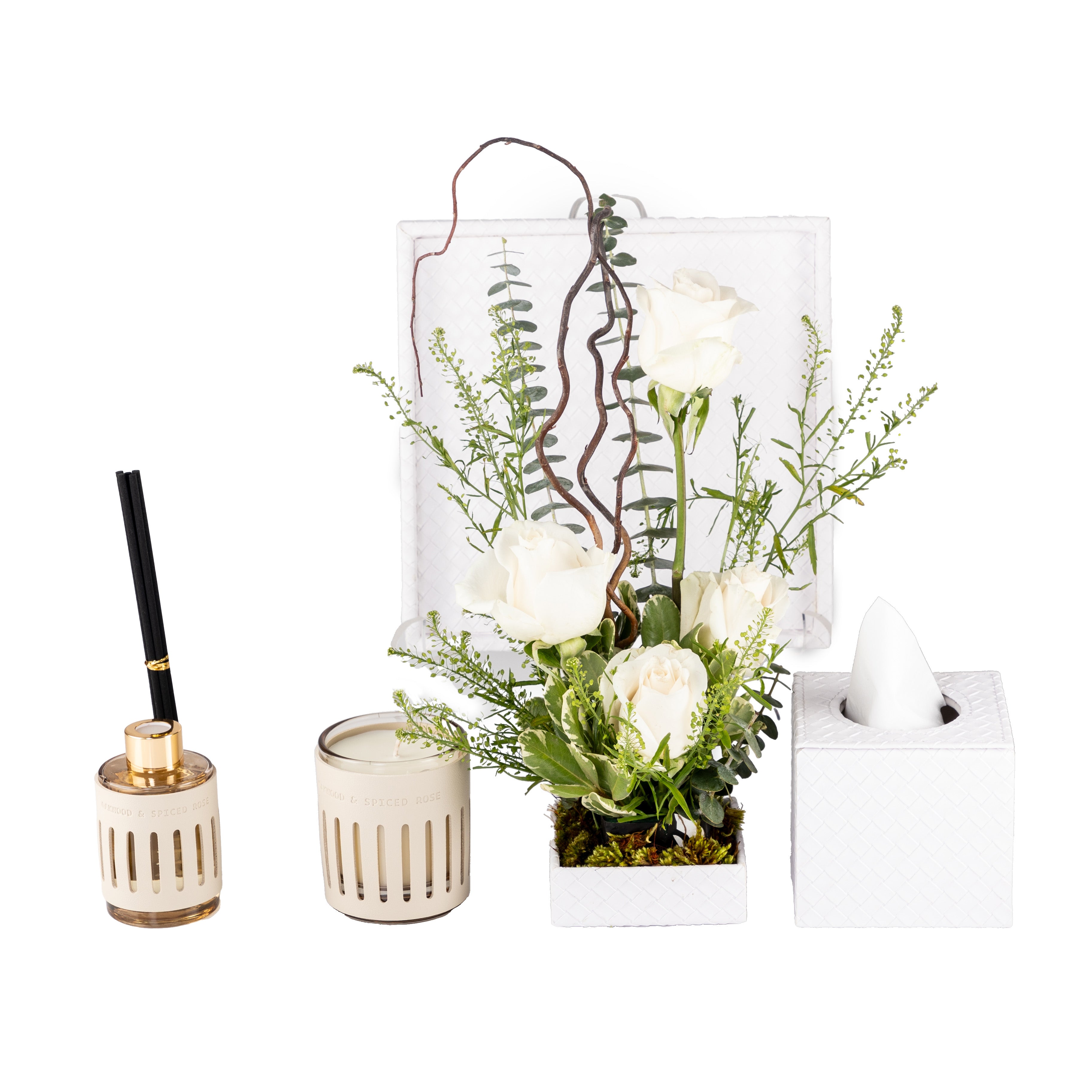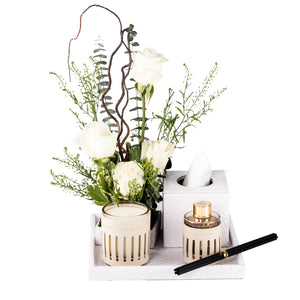 Elevate any space with this refined leather tray gift set, thoughtfully arranged with a diffuser, candle, tissue box, and a mini floral stand. Adorned with a graceful mix of roses, eucalyptus greenery, safari mix, and lepidium, all delicately set in a flower sponge for long-lasting freshness. A perfect gift for celebrations, gratitude, or stylish home décor.