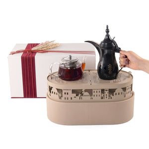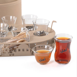 Add a touch of elegance to any occasion with the Al-Yamal Set. Crafted from durable metal with a refined leather base, this set is both stylish and functional. It includes 6 tea glasses, 6 coffee cups, and 2 easy-to-clean acrylic boxes. Beautifully presented in a premium gift box from "Gift Gate," it’s the perfect choice for a thoughtful and luxurious gift.