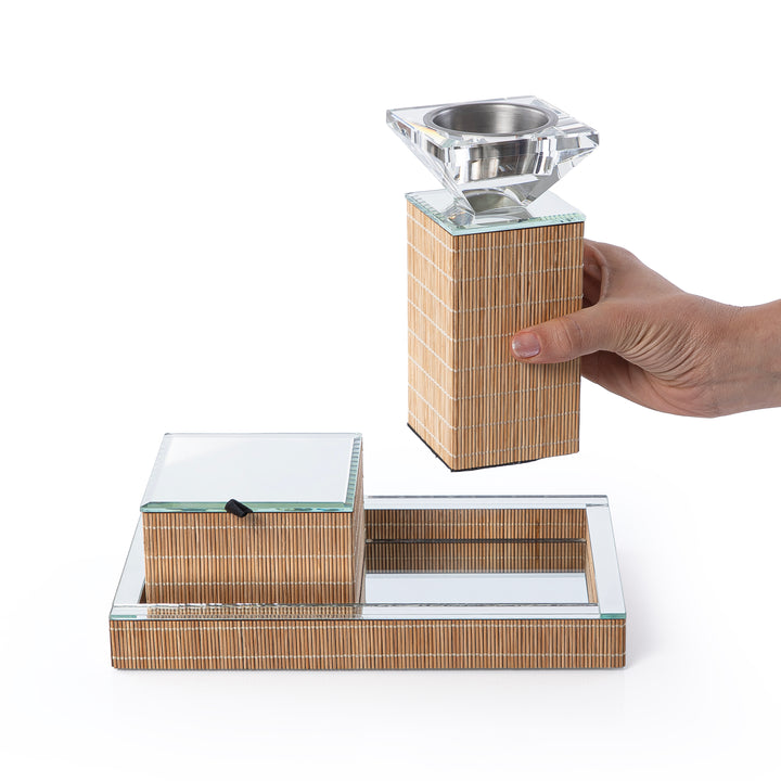 Elevate your incense ritual with this sophisticated Daay Mabkhar Set from Cristal. This curated collection combines three essential elements: an elegant tray for presentation, a traditional mabkhar burner for aromatic diffusion, and a protective box for storage. Crafted with attention to detail, each piece reflects authentic craftsmanship. Perfect for creating an ambient atmosphere in your home or as a thoughtful gift for those who appreciate fine fragrance traditions. A complete solution for incense enthusiasts seeking both functionality and aesthetic appeal.