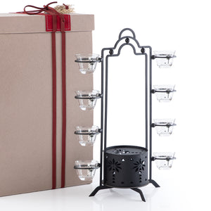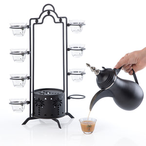 It consists of : stand of dallah with a metal coffee cup holder , 8 glass coffee cup with a gift box .