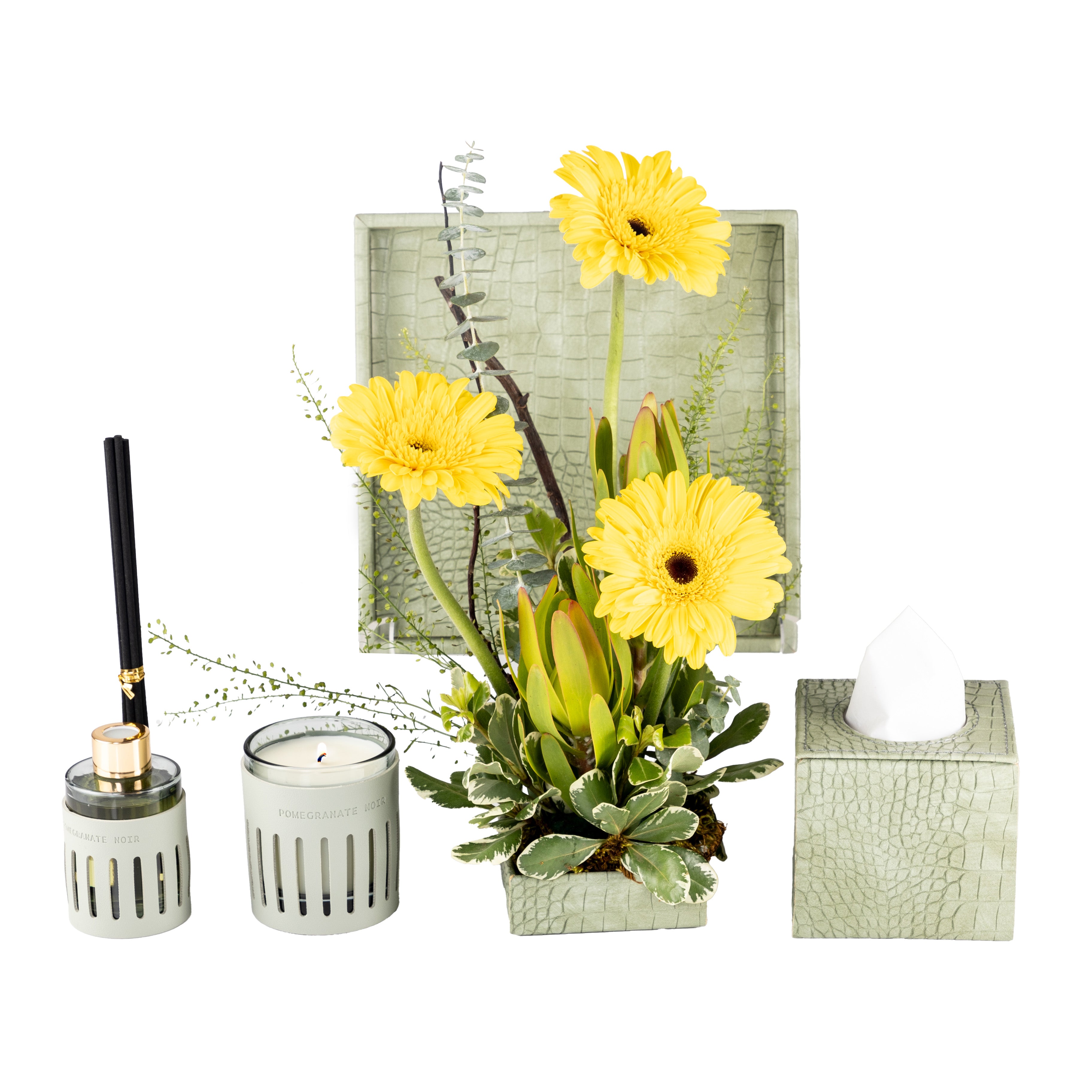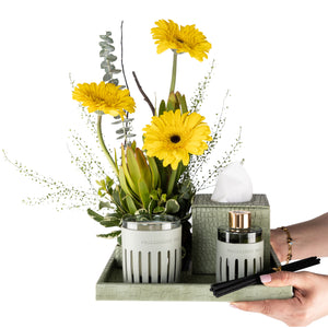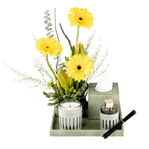 Bring calm and charm into any setting with this elegant square leather tray set. It features a diffuser, scented candle, tissue box, and a small floral stand. The arrangement includes a vibrant gerbera mix, safari mix, lepidium, and pittosporum, beautifully designed on a flower sponge to keep it fresh and radiant. A graceful gift for any special occasion or home decor.