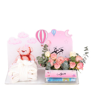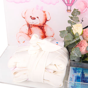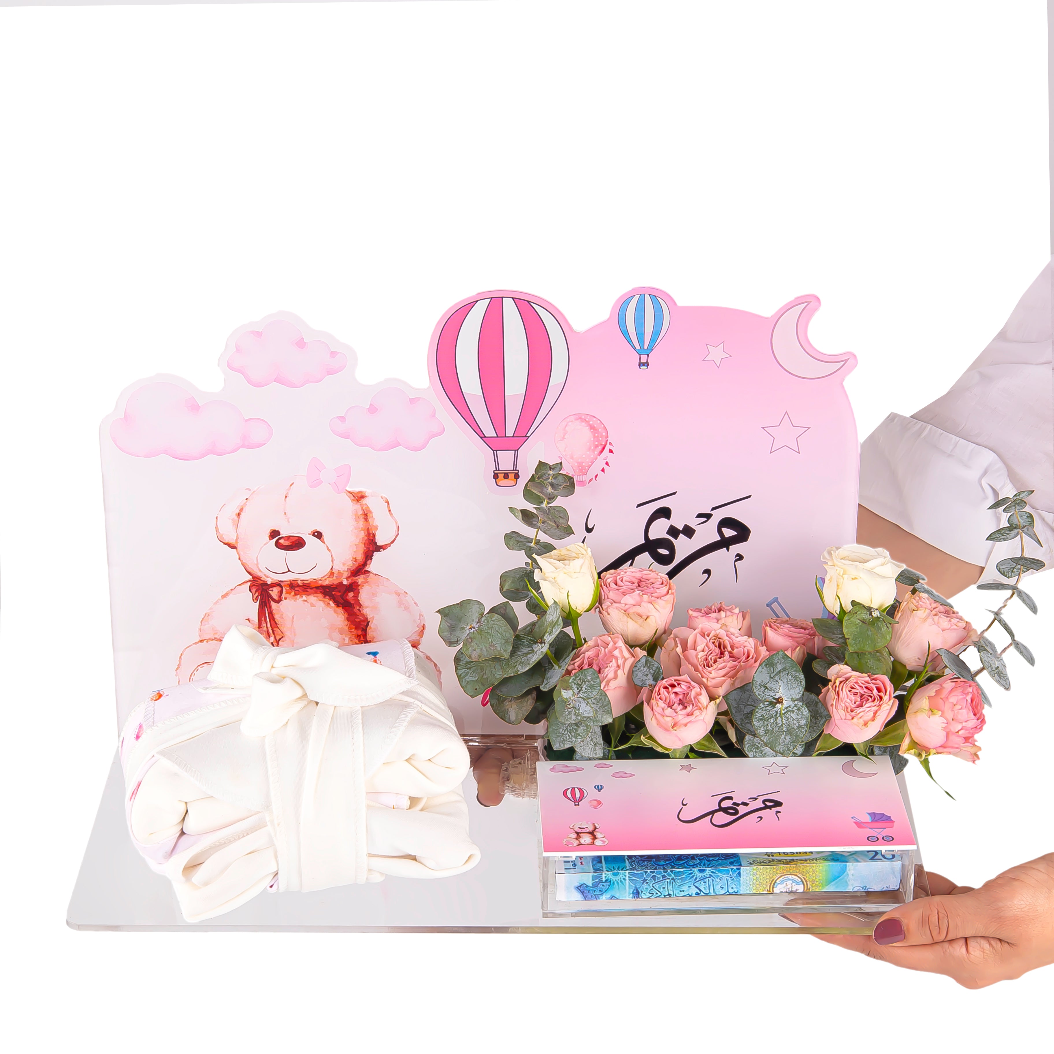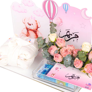 تيدي ديير 2 هدية للمولود الجديد تتكون من بوكس اكريليك أنيق مع استاند يمكنك طباعه اسم المولود عليه، مع تنسيق ورد طبيعي ليعطي لمسة من الفرح ، كما يمكنك وضع مفاجأة نقدية تضيف لمسة من السعادة. هدية مثالية تجمع بين الأناقة والفرح