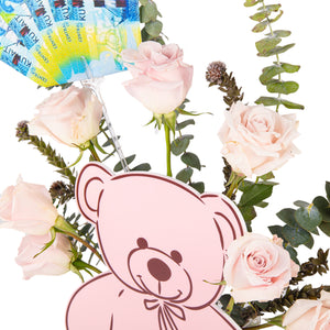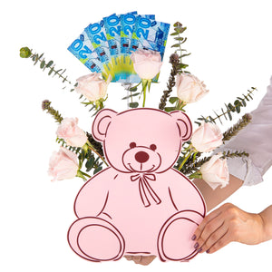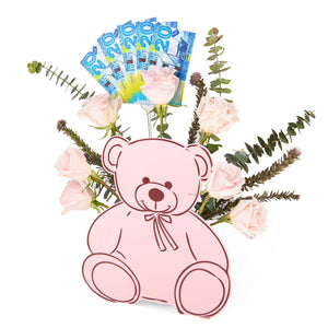 تيدي بينك هدية للمولود الجديد تتكون من استاند اكريليك أنيق على شكل دب بينك مرح، واتاحة وضع مفاجأة نقدية تضيف لمسة من السعادة. هدية مثالية تجمع بين الأناقة والفرح