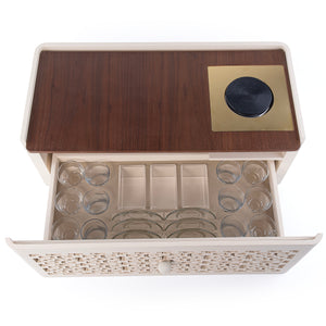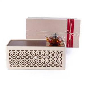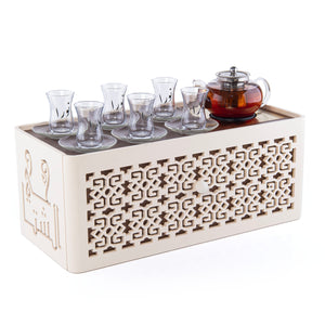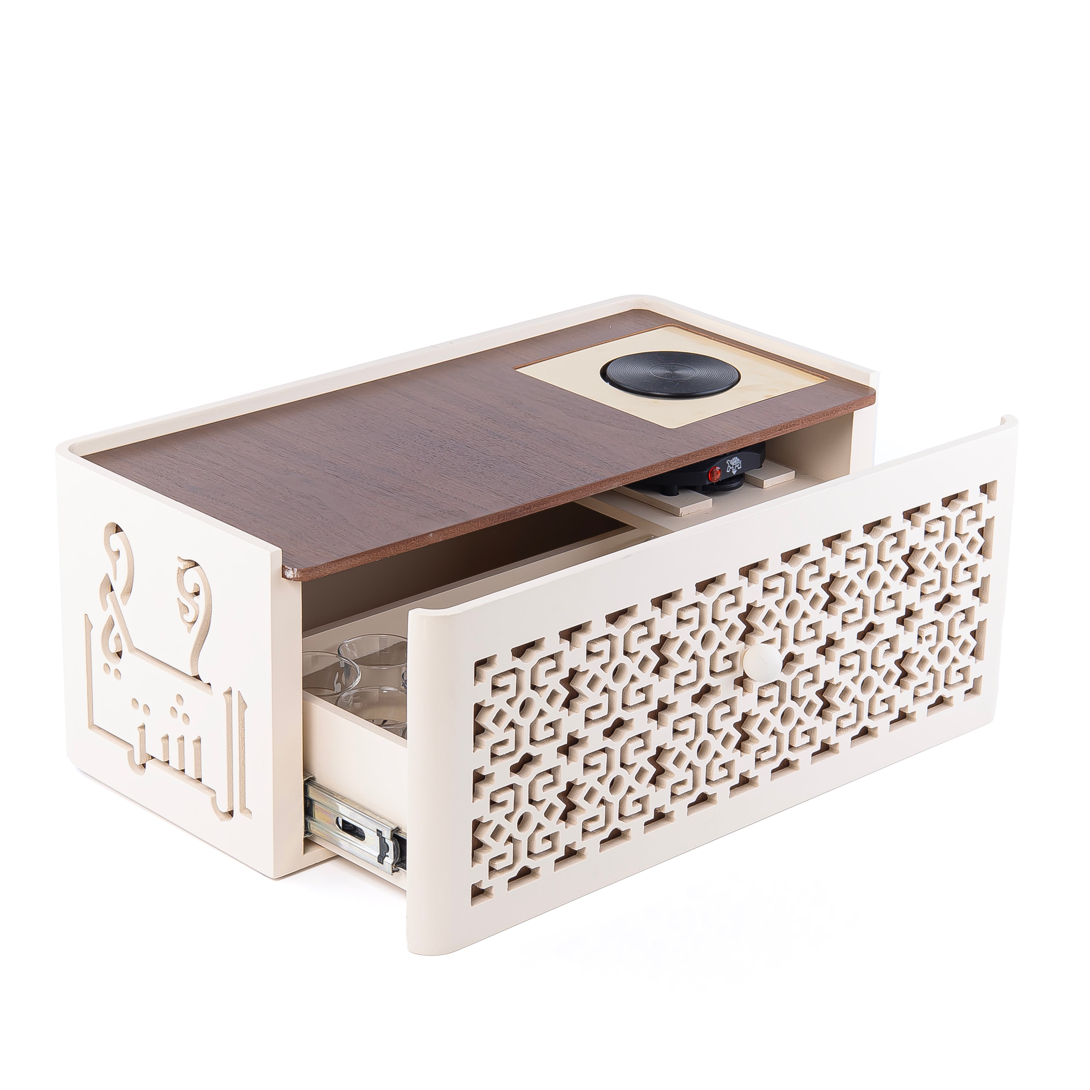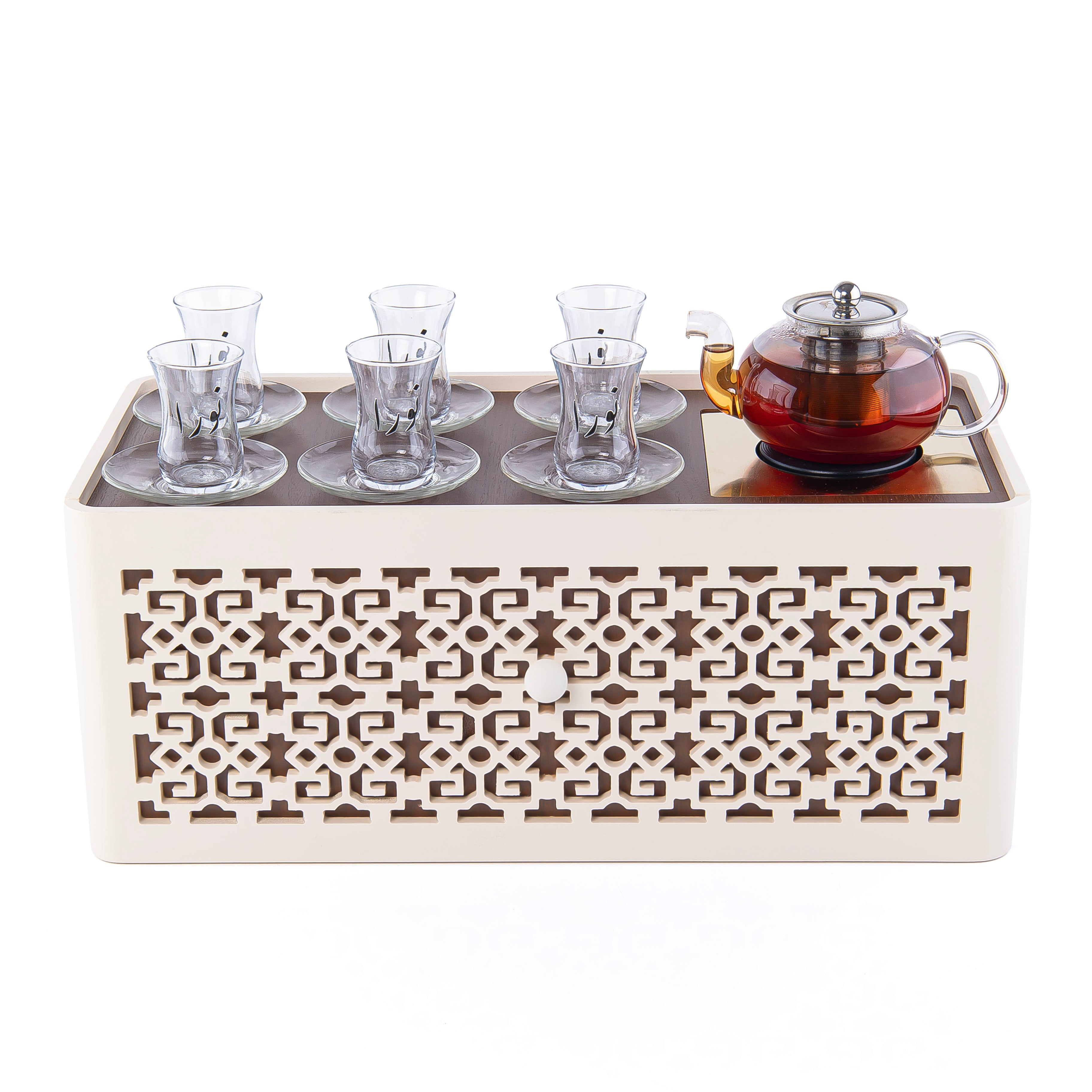 أبهري ضيوفك مع طقم نقوش دوه الرائع، وهو صينية تقديم كهربائية أنيقة مصنوعة من الخشب والمعدن، مزودة بدرج يتسع لستة أكواب شاي، وستة أكواب قهوة، وستة أطباق زجاج، مما يجعلها قطعة أساسية في أي منزل. يأتي الطقم في علبة هدايا فاخرة، ليُضفي لمسة جمالية على أي مكان.