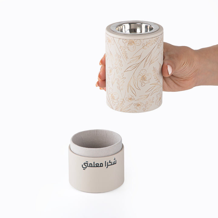 مصممة بزخارف نباتية أنيقة مطبوعة بتقنية UV وملفوفة بجلد سادة باللون البيج الفاتح، لتجمع بين التصميم العصري والوظيفة التقليدية.