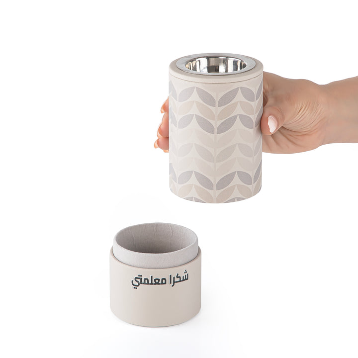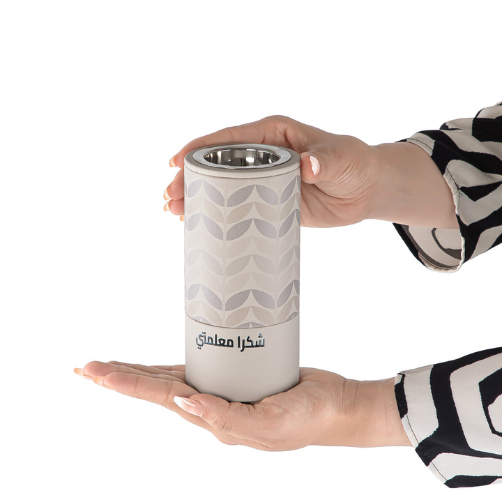 مصممة بزخارف نباتية أنيقة مطبوعة بتقنية UV وملفوفة بجلد سادة باللون البيج الفاتح، لتجمع بين التصميم العصري والوظيفة التقليدية.