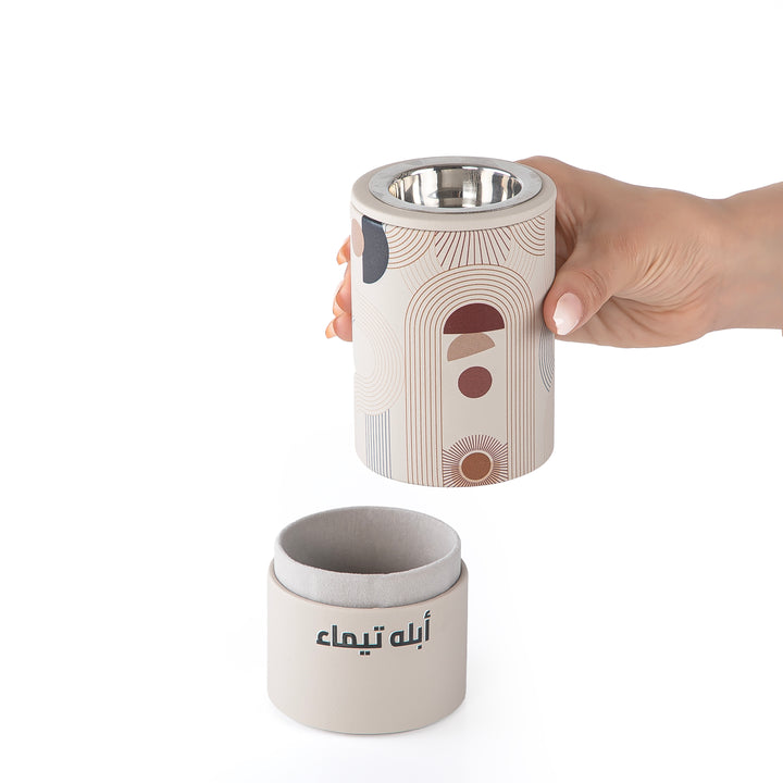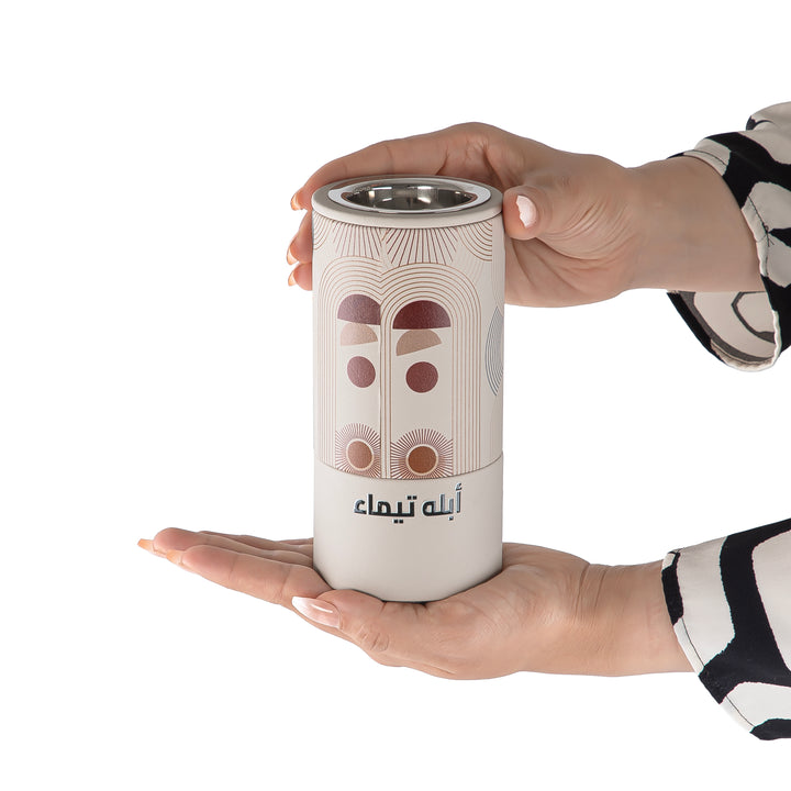 مصممة بزخارف نباتية أنيقة مطبوعة بتقنية UV وملفوفة بجلد سادة باللون البيج الفاتح، لتجمع بين التصميم العصري والوظيفة التقليدية.
