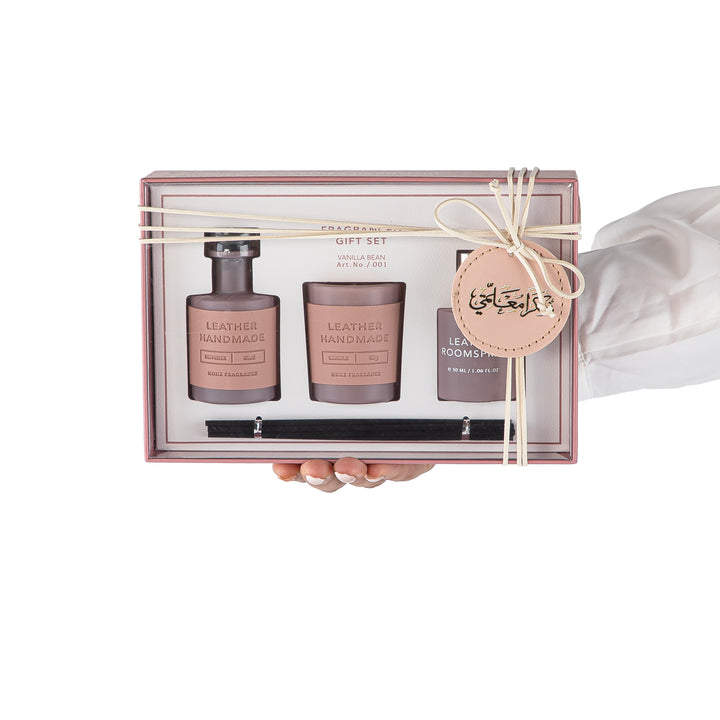 طقم أنيق مقطوع بالليزر، يضم ناشرًا وشمعة مغلفين بالجلد يدويًا، يضفي لمسة راقية وفاخرة. مع عطر منزلي فاخر، يُضفي هذا الطقم جوًا دافئًا وراقيًا. يأتي في علبة أنيقة، مثالية للهدايا في المناسبات الخاصة كعيد المعلم.