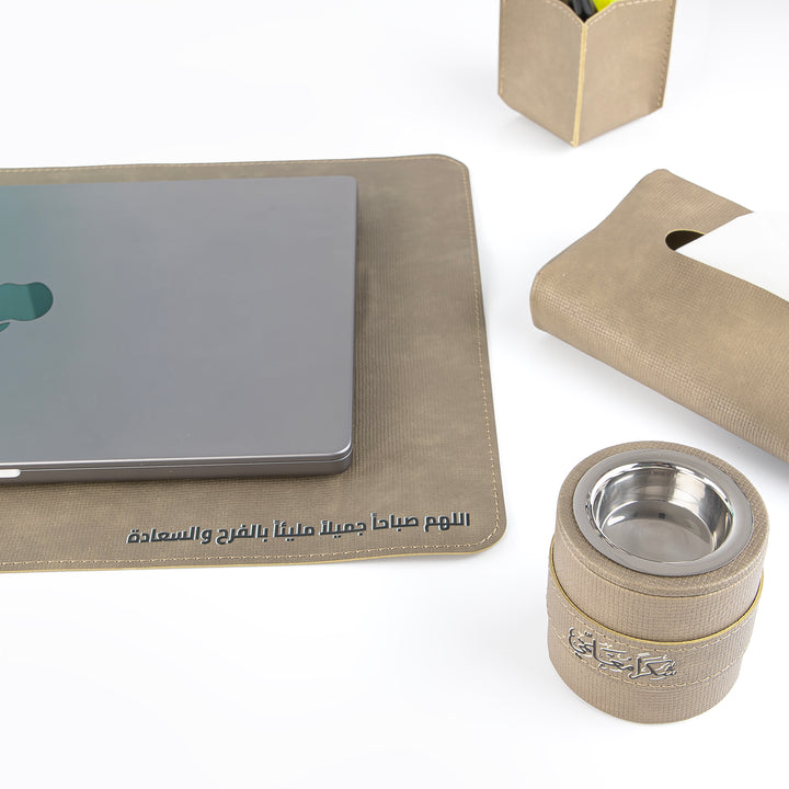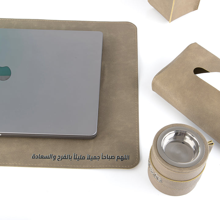 أضف لمسة من الفخامة والتنظيم إلى مكتبك مع هذا الطقم المكتبي الجلدي الأنيق باللون البيج.